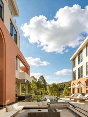 雲嵐牧場度假品牌以“自然生活、簡單快樂”為宗旨, 開創 “食宿+自然研學×親子共創×娛樂體驗×美學探索" 的一站式度假縱野。 雲嵐牧場度假酒店毗鄰雲嵐牧場, 佔地32.94畝,集自然野趣、奶牛文化、親子人文於一體。酒店涵蓋主題客房、“且加餐”全日制餐廳、配套餐飲包廂6間、無柱多功能宴會廳1間、會議室3間。 配套有沉浸式奶牛博物館 (建設中)、鮮奶工坊(建設中)、旋轉書吧、自然研學課堂,還有室內室外樂園、 兒童戲水池、 戶外湯池、 瑜伽室及健身房等度假設施, 滿足全年齡度假需求。酒店建築運用“天人合一、 因地制宜 " 的理念,採用水平延展式佈局, 建築亦有生命和植物共同生長 , 追求建築在自然中的 “消隱”。以原生水泥飾面與層疊片牆實現與自然景觀的有機融合。 建築設計師通過弱化建築邊界、引入流動空間概念, 讓曲面牆體順應山風軌跡, 使整體建築猶如一片舒展的葉片, 靜靜棲息於羣山環抱之中。