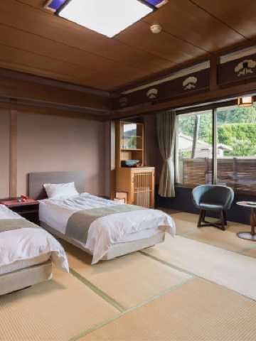 這是一座日本旅館, 坐落在 Ureshino 河邊, 俯瞰着温泉城。 茶的氣味在室外的茶浴中能得到治癒。