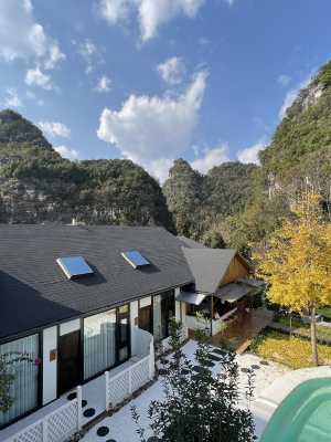 新中式裝修風格房子,簡約大氣,每間房都擁有全景落地窗,推窗遠眺,獨享峯林美景,一窗一風景,一戶一景緻。徐霞客遊記下記載的西南奇勝,陶淵明筆下的歸園田居在這裏都可以享受到。原木素色傢俱散發着新中式的清新氣象,360°景觀露台,白天看山野精緻,夜幕下遙望星辰,500㎡超大庭院,夏天必打卡的蒂夫妮湛藍天空色無邊泳池,客人可以趴在泳池邊看無邊山色,暢遊山水間,全景景觀餐廳視野開闊。