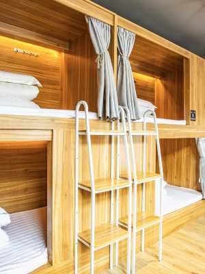 全部採用木製床,床品為天然乳膠床墊及枕頭,床內配有隱私簾、掛衣鈎、小桌板、氛圍燈、閲讀燈,每個床位都會配備獨立的電子鎖小櫃子。3件套一客一換,已提前為大家鋪好,退房時需要客人自行拆下(這樣間接證明了我店三件套一客一換,您拆下來的再裝上實屬多此一舉。)
