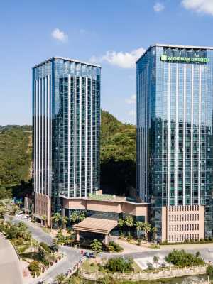 玉環中心温德姆花園酒店位於浙江省玉環市玉城街道城中路333號,城市核心CBD吾悅國際旁,總用地面積28783㎡,總建築面積103613.01㎡,層高26層,按照星級酒店標準設計與建造。 酒店設有總統套房、高級套房、高級大床房等各類客房,其中10樓為童趣親子主題客房,以及酒店式公寓、行政酒廊、宴會廳、中西餐廳、大堂吧、健身中心、游泳池等綜合服務設施。宴會廳位於酒店三樓,坐擁2,900平方米的會議空間,無柱宴會廳面積900平及5個多功能廳,並擁有完善的設施,先進的會議設備,裝飾華美而精緻的水 晶吊燈。停車場地下室加地面上共有450個停車位。