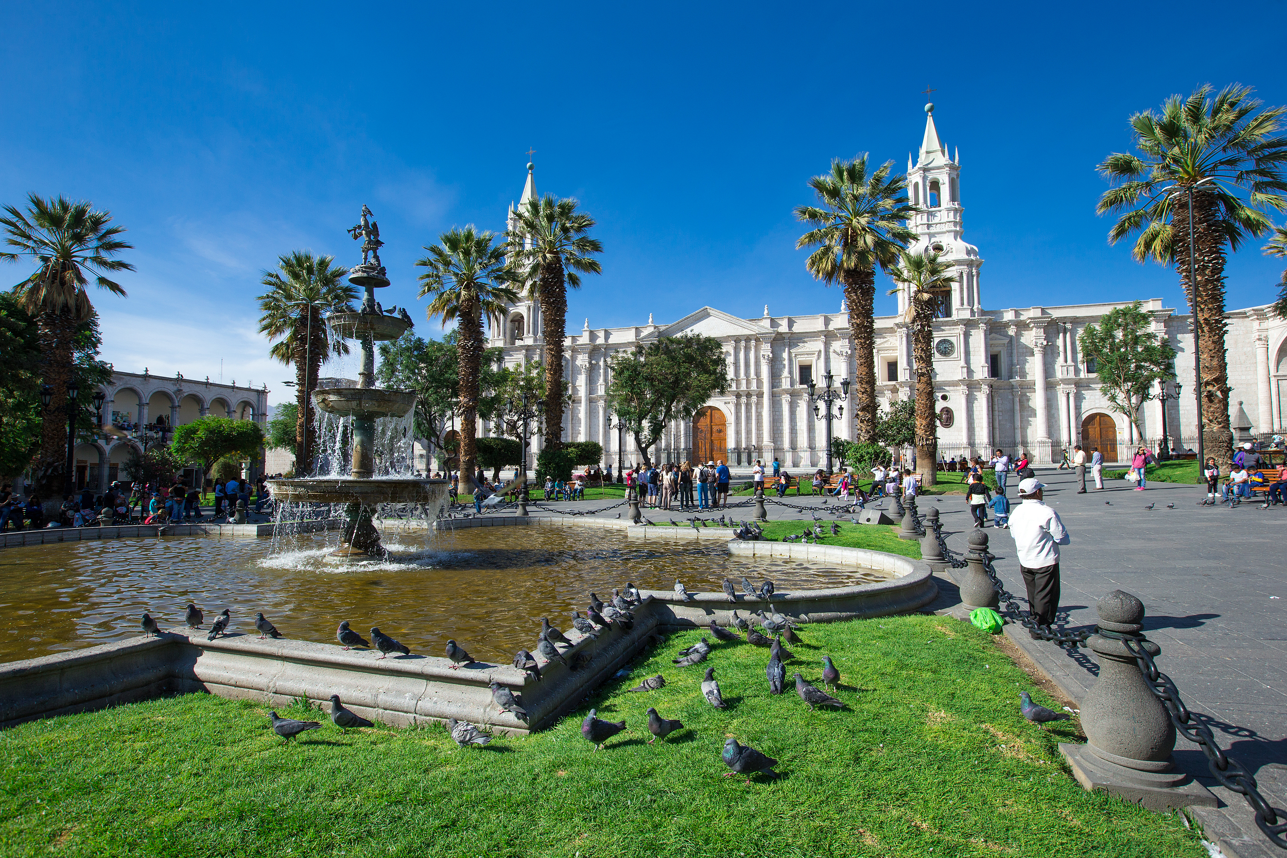 <div>阿雷基帕阿馬斯廣場位於秘魯阿雷基帕市中心,是這座 “白色之城” 的核心與靈魂。廣場四周被殖民時期的白色火山岩建築環繞,風格獨特,充滿歷史韻味。其中,阿雷基帕大教堂特別引人注目,它曾經經過兩次地震和一次火災,如今我們看到的是 1868 年重建後的模樣,教堂內珍藏著許多精美的宗教藝術品。</div><div>廣場中央設有一座噴泉,清澈的泉水在陽光照耀下閃爍著光芒,為廣場增添了幾分靈動之氣。這裡是當地人和遊客休閒的好去處,人們可以在廣場中央的板凳上休息,欣賞周圍的美景,或是投餵來往的鴿群。每週日,廣場上還會舉行升旗儀式,莊嚴,吸引許多市民和遊客前來圍觀。此外,廣場週邊旅行社、飯店、餐廳、特產店林立,方便遊客探索阿雷基帕的各個面向。</div>