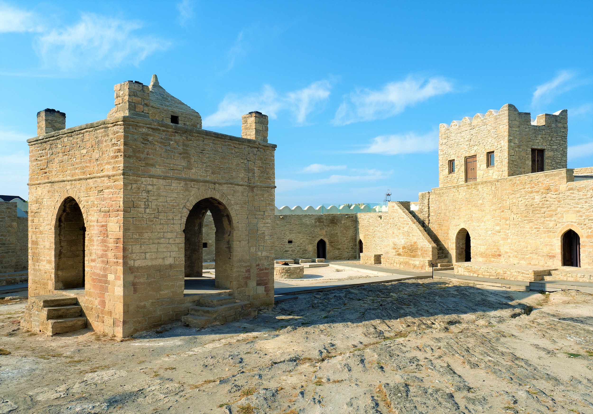 Ateshgah,是波斯語,意思是“火地”,也就是有聖火的地方、祭祀聖火的地方。巴庫地區盛產石油和天然氣,很多天然氣遇到明火後,就形成了長明火,在古代這些長明火被認為是神蹟,當年也就成為了印度教教濕婆派的聖地。原有的長明火在19世紀因為資源枯竭已經熄滅,如今遊客看到的是蘇聯時期人工重新接入的,所以在火祠院內的地面上,你能夠看到很明顯的天然氣管道。這裏的公共交通並不是很發達,遊客一般是包車前往這裏。在火祠邊上有些房屋,裏面有一些當地的文化、歷史方便的展示,房屋的門框比較矮,進門注意碰頭。