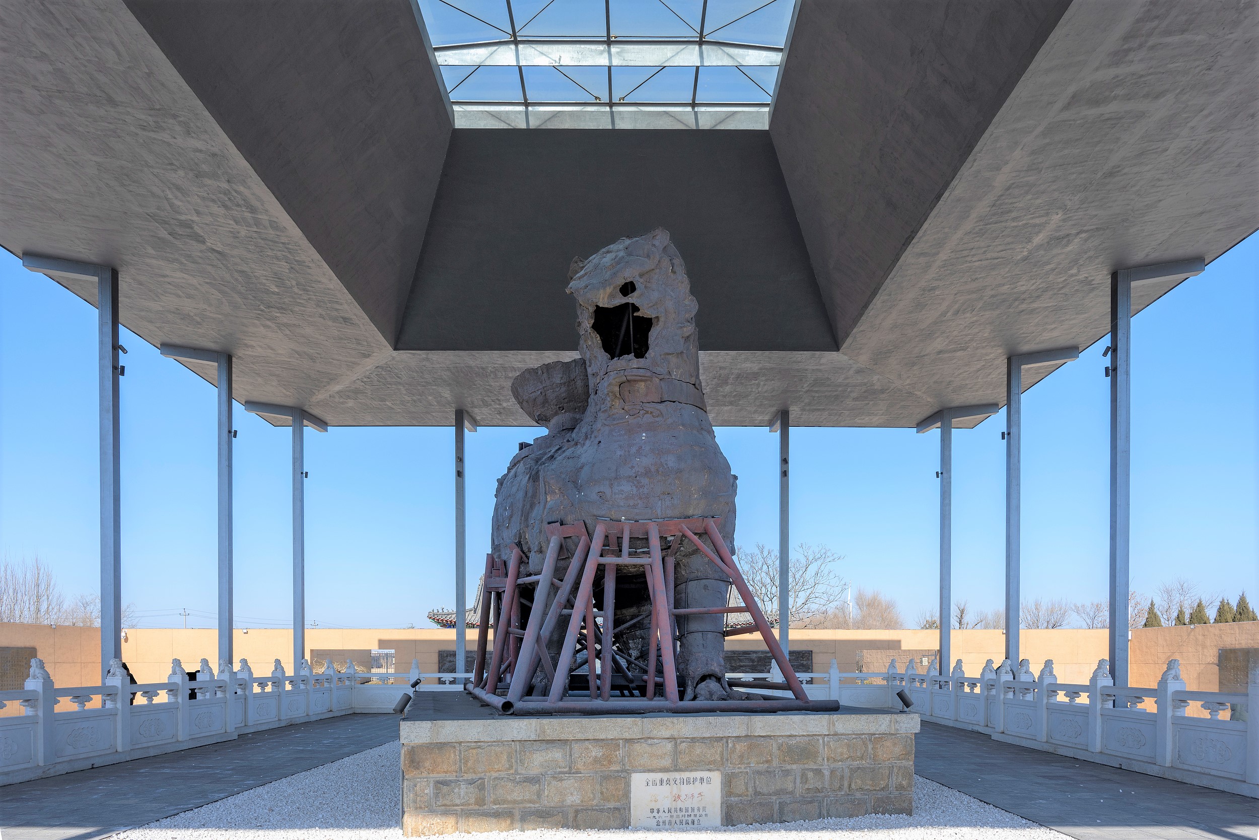 滄州鐵獅子位於滄縣縣政府駐地東南偏北方向。鐵獅相傳為遏制海嘯水患而鑄造的,是我國現存年代較久、形體較大的鑄鐵獅子。滄州鐵獅子獅身向南,獅頭向西南,兩左腳在前,兩右腳在後,呈前進狀態,姿態雄偉,昂首闊步,充分地展示了古代鐵藝的精巧。