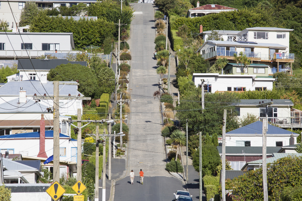 <p class="inset-p">但尼丁的鮑德溫大街(Baldwin St.),坡度為35%,是世界上最陡峭的有人居住的街道。走在這條長度約350米的街道上,平均每走2.86米,高度就提升1米,“爬”到路的盡頭,感覺猶如在登山。</p><p class="inset-p">據說鮑德溫大街是由一些從沒到過達尼丁的英國城鎮規劃者設計的,他們只是在圖紙上畫了一些簡單的格子和線條,卻就此成就了一項吉尼斯世界紀錄。它的傾斜度令很多司機望而生畏。由於這條街的不尋常的傾斜度,很多來但尼丁的人們都會慕名前來拍照,並擺出各種有趣的姿勢。更有趣的是,每年7月,但尼丁的巧克力廠商會把1萬個特大號的巧克力糖塊從坡頂上咕咚咚滾下來,免費送給熱情觀看的人們吃。</p>