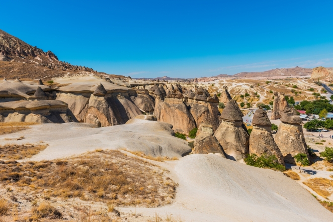 <p class="inset-p">仙人煙囪形成於數百萬年前,當時卡帕多西亞地區的火山噴發,大量火山灰和熔岩堆積形成凝灰岩和熔岩層,後經長期的風化和水流侵蝕,鬆軟的凝灰岩被逐漸侵蝕,留下堅硬的部分,形成瞭如今的奇特地貌。</p><p class="inset-p">仙人煙囪形態各異,通常呈錐形、塔形或柱狀,頂部有一個較寬的「帽子」狀岩塊,形狀像蘑菇或煙囪。其顏色豐富,從淺灰色到紅棕色不等,因礦物質含量不同還會呈現黃、粉、白等色彩。高度從幾米到幾十米不等。這些煙囪不僅是自然奇觀,還具有重要的人文價值,早期居民在岩石中開鑿洞穴作為住所、教堂或避難所,部分至今仍保存完好。</p>