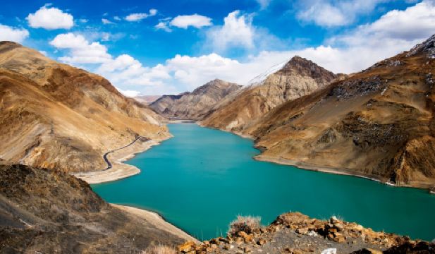 滿拉水庫位於江孜縣龍馬鄉境內年楚河上游,和羊卓雍錯類似,是嵌在山間的一汪碧水。雖然是人工水庫,但碧綠色的湖水映襯着遠山,顯得格外美麗。從江孜縣城去往羊卓雍錯時會經過這裏,路邊有小亭子,可以在此從高處眺望水庫的景色,順便稍事休息一會兒也很不錯。
