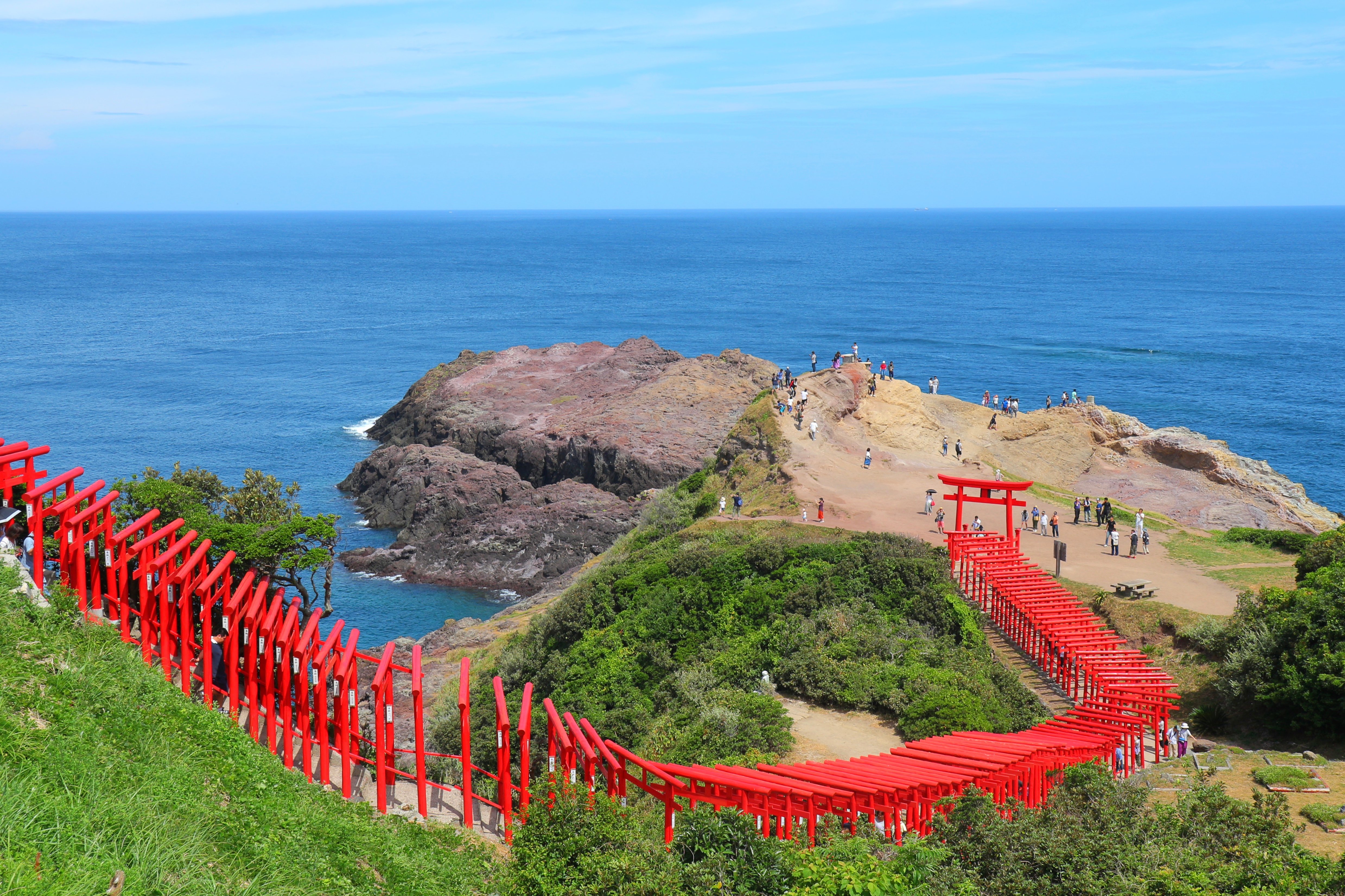<p>在藍天碧海和綠林的交相輝映下,元乃隅神社這一排連綿不絕的紅色鳥居令人震撼,2015年被美國CNN電視台給予美譽。</p><p>在神殿遺址的大型鳥居的頂部,有一個硬幣盒,很多人會嘗試投硬幣進去,這也是吸引眾多遊客打卡的原因之一。</p>