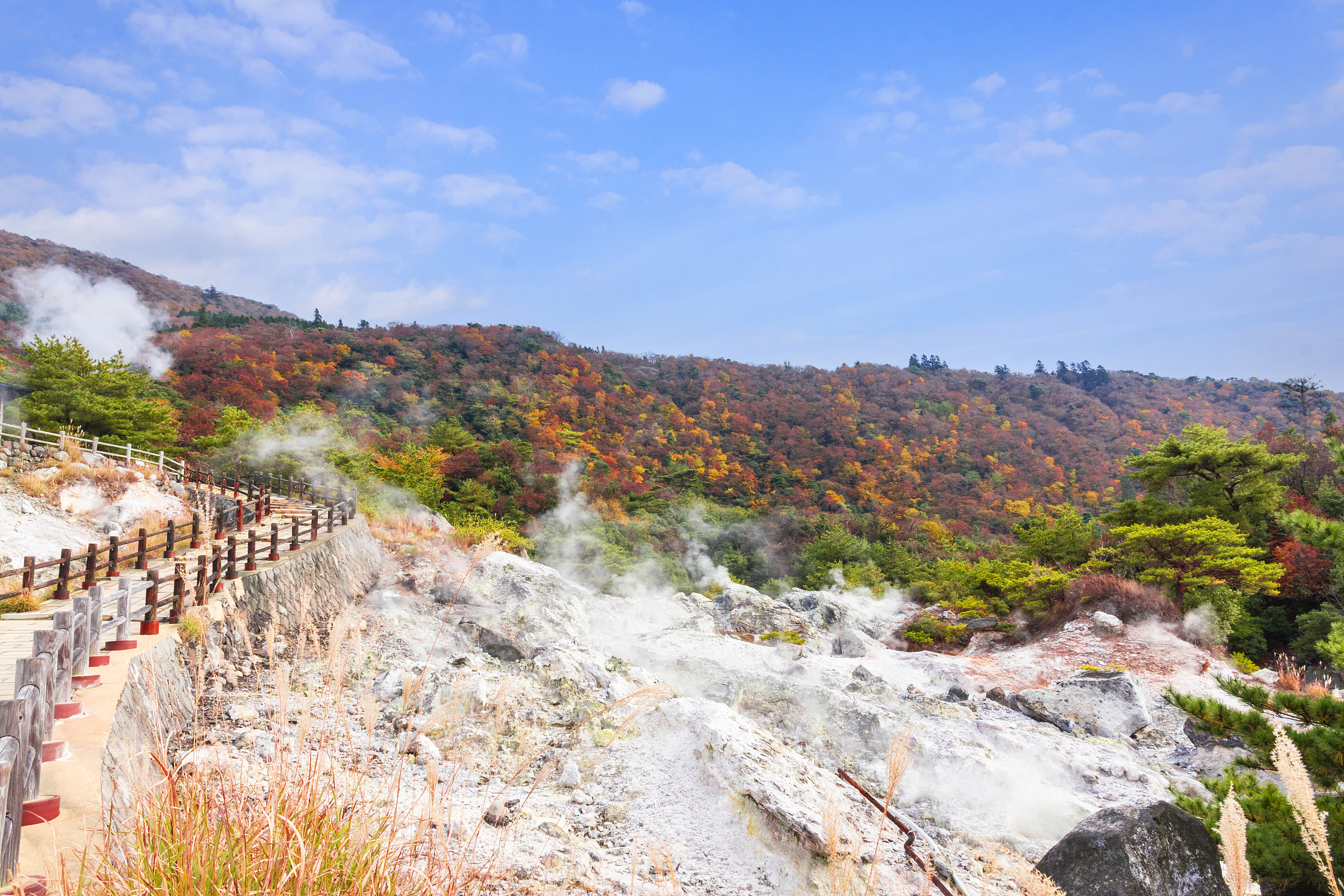 該景點是日本有名的温泉地。這裏約有30個觀光景點,水氣噴射,白煙裊裊,煙霧繚繞。這裏比較有名的温泉100多攝氏度,熱泉奔騰不息。遊人看到如此壯觀的景色,就會大聲叫喚:“好棒呀”,這裏還流傳着悽婉動人的歷史傳説。