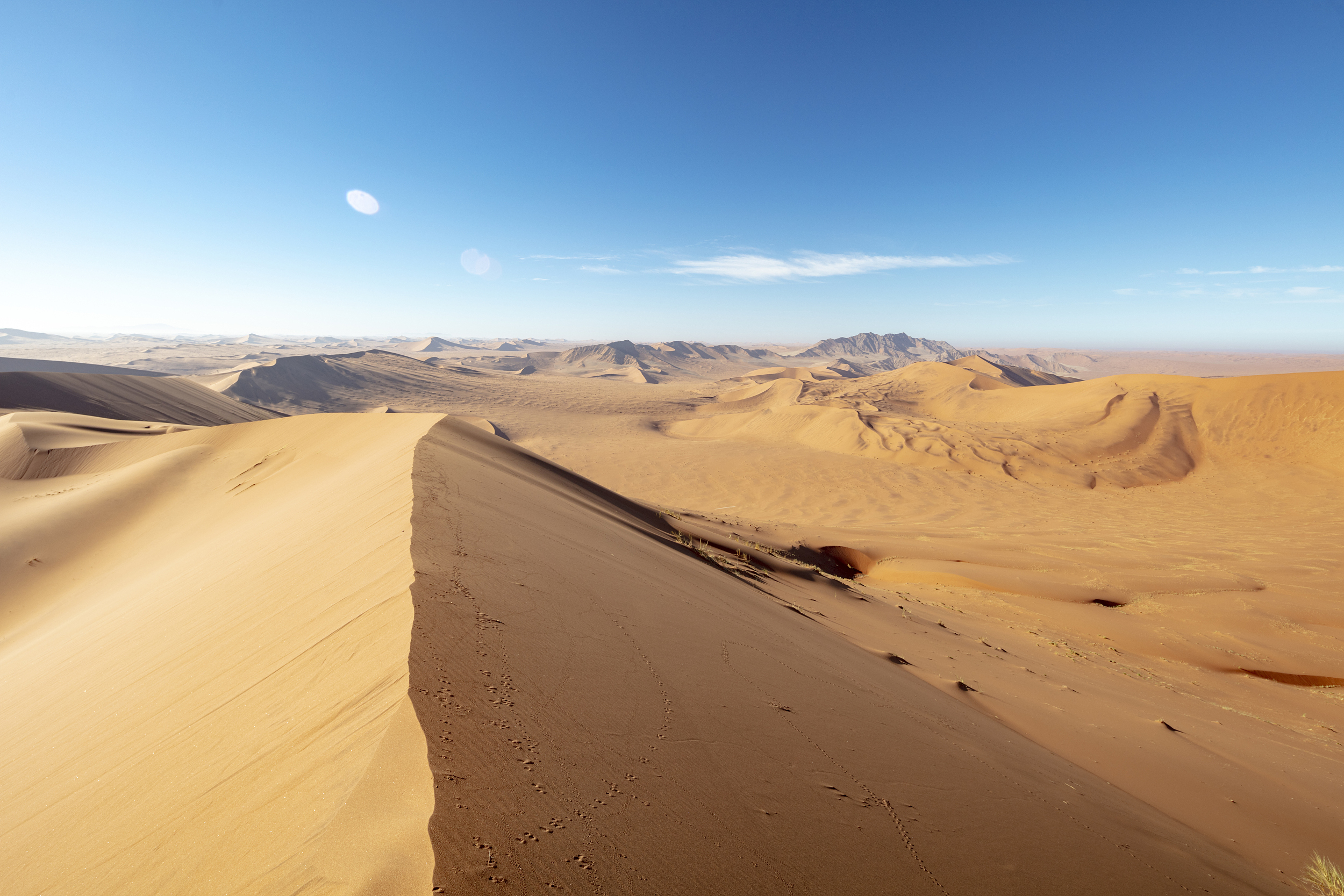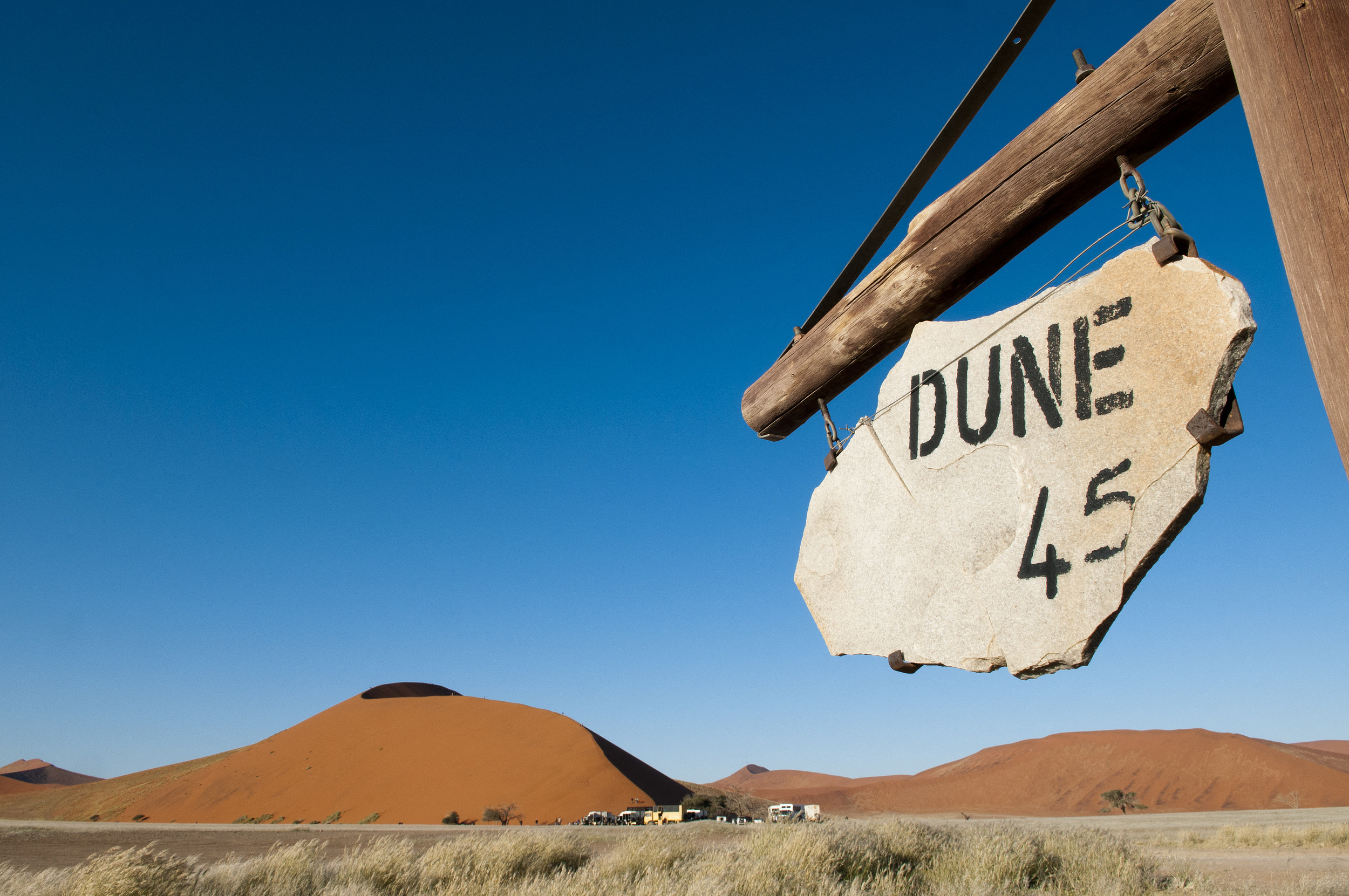45號沙丘以其壯觀的紅色沙丘聞名於世,其獨特的紅色來自沙粒中富含的氧化鐵,這種顏色在清晨和傍晚的陽光下尤為鮮豔奪目。陽光的角度和強度使沙丘的色彩和陰影變化多端,為攝影愛好者提供了拍攝機會。攀登45號沙丘是令人難忘的體驗,遊客可以俯瞰整個沙漠的壯麗景色,感受到大自然的恢宏與靜謐。沙丘頂部的視野開闊,尤其是在日出或日落時分,整個沙漠被染上金色的光輝,景色美不勝收。 45號沙丘不僅是自然奇觀,也是人們探索大自然、挑戰自我的理想之地。遊客在這裡不僅可以體驗到攀登沙丘的樂趣,還能感受到納米布沙漠的神秘與壯美。