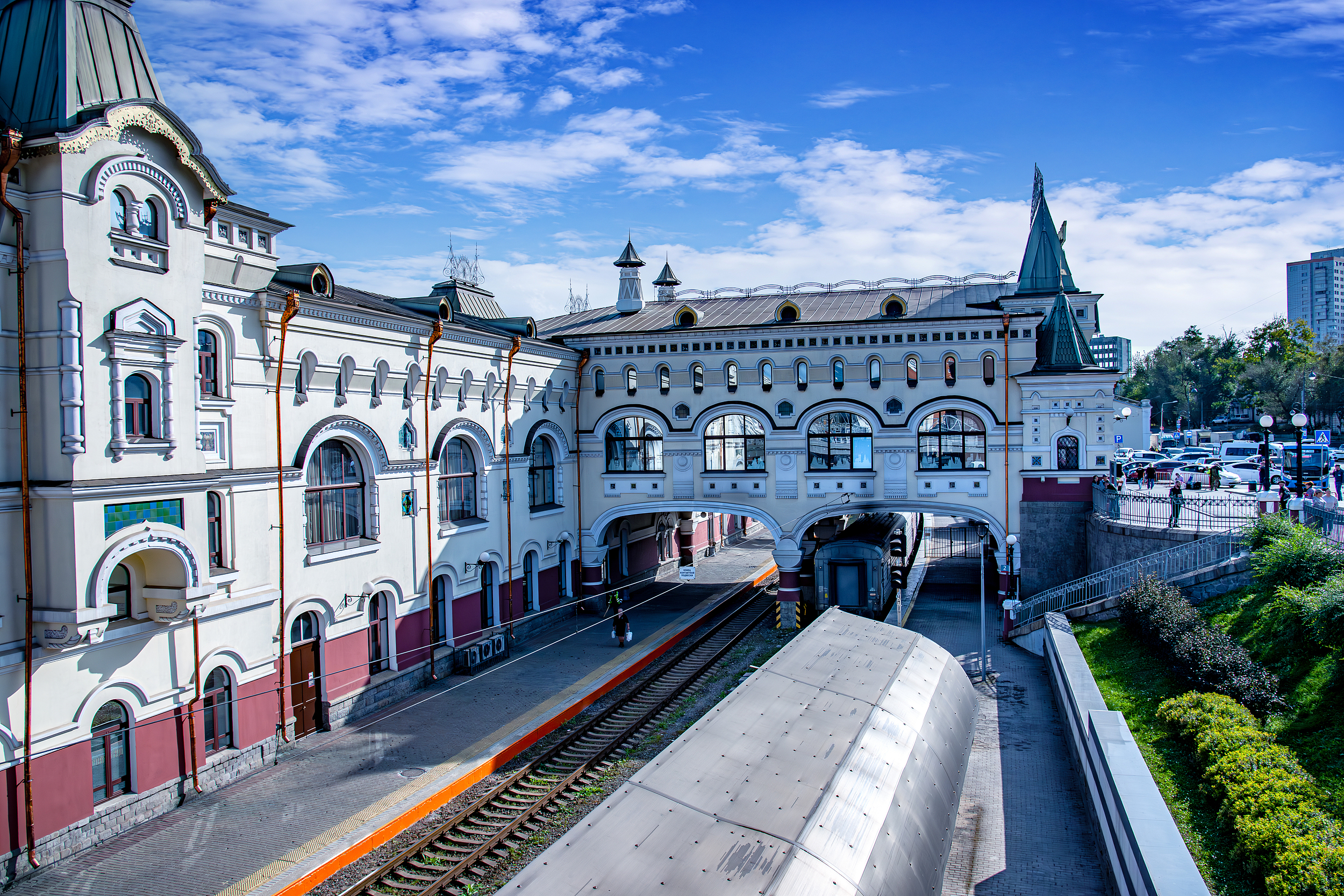 <div>海參崴火車站是西伯利亞鐵路的東端終點,與其說是火車站,不如說是一種象徵。月台上有9288字樣的雙頭鷹雕塑,顯示從這到莫斯科的距離是9288公里。而整體極具俄羅斯風格的外觀也讓人聯想到17世紀俄羅斯建築藝術的代表作品,給人一種複雜多變的視覺美感。</div><div><br></div><div>精美古樸的外觀</div><div>火車站外觀精美古樸,充滿貴族氣息。主入口採三聯拱門形式,屋內為冰刀狀屋頂,有許多小帳篷頂端點綴其中。</div><div><br></div><div>別緻的天花板棚畫</div><div>車站內部佈置也很別緻,尤其是天花板上的棚畫,很有特色。棚畫的主題是「我們偉大的祖國」。上面有兩組繪畫,一邊畫著海參崴市容景象,有火車站、艦隊、蒸氣機車,中間的兩個人物是末代沙皇尼古拉二世和遠東總督穆拉維約夫阿穆爾斯基;另一側面是莫斯科的城市景象,有瓦西里升天大教堂、莫斯科大劇院等。</div><div><br></div><div>和中國不同,海參崴火車站沒有售票口,也沒有檢票口。旅客不用在火車站買票,直接從月台上車,然後在車上買票即可,所以候車室幾乎沒有人。</div>