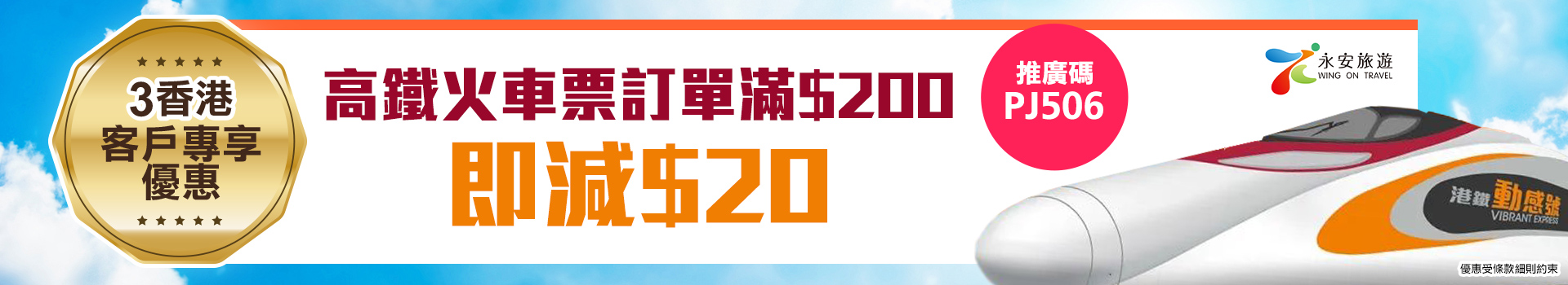 3. 於優惠期間,憑指定推廣碼於永安旅遊網站或手機 APP,預訂香港西九龍高鐵站往來之高鐵火車票滿HK$200或以上可享HK$20即時折扣,名額共限首1000單,先訂先得,額滿即止;