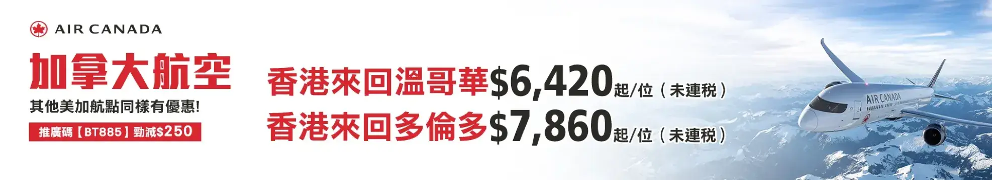 使用推廣碼【BT225】訂購加拿大航空往來香港來回機票。