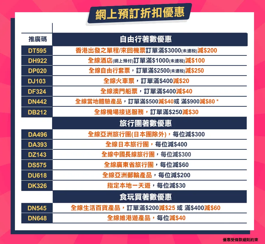6. 推廣碼不能兌換成現金、其他產品或折扣,亦不能轉移至其他會員帳戶內,並不得用於任何已完成/提交/成功預訂的訂單。