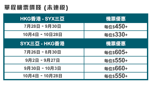 | 香港 來回 三亞 | 經濟艙 價格 (來回未連稅) |