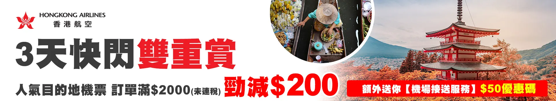 香港出發來回/單程之香港航空機票,首200成功訂購之訂單,可額外獲得【機場接送服務】$50優惠碼,讓你輕輕鬆鬆踏上旅程!