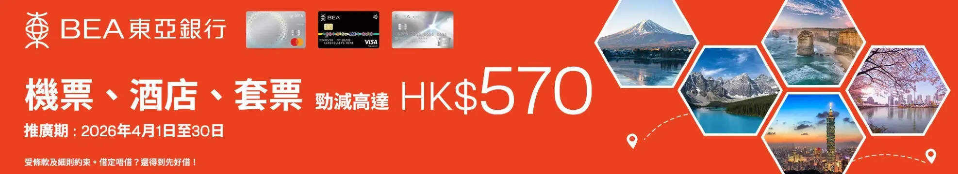 - 機票優惠適用於全球航線機票(需由香港出發或回程),不適用於多程目的地機票;酒店優惠適用於全球酒店之預付房間的房價。