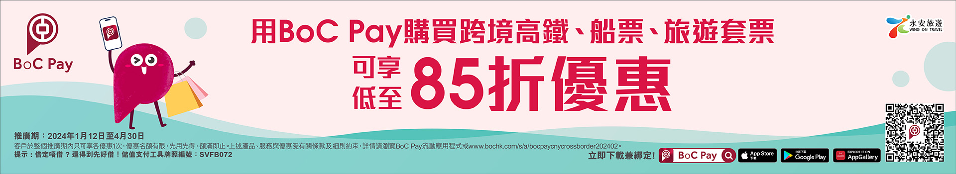 1. BoC Pay X永安旅遊「月Pay月賞」(下稱「本推廣」)之推廣期只適用於2024年1月12日00:00-4月30日23:59 。