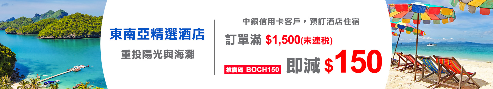 ii. 憑推廣碼【BOCH150】預訂本地海外酒店住宿並憑合資格信用卡單一簽賬滿HK$1,500,可享 HK$150即時折扣,每筆合資格交易一最高可即時扣減HK$150;