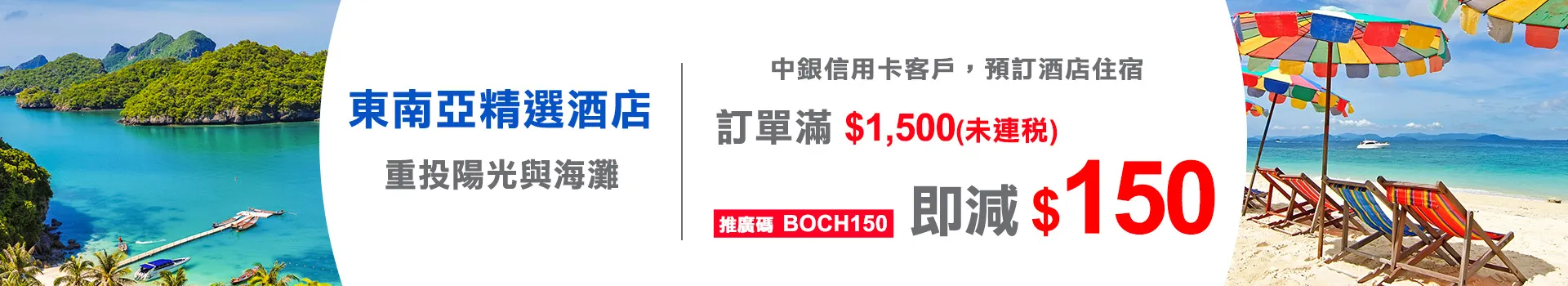 由2023年4月19日起至6月30日以中銀Visa/Mastercard信用卡預訂本地酒店或海外酒店住宿,訂單滿$1,500,即減$150