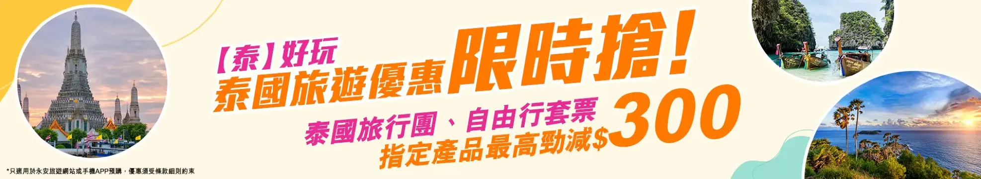 2. 優惠適用於永安旅遊網上﹑APP應用程式、門市及熱線中心預訂指定泰國旅行團,即減$300。