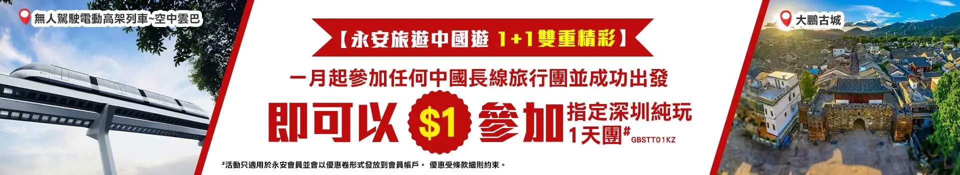 1. 活動期間,每個會員帳戶凡報名中國長線任何團隊並成功出發,可獲贈深圳純玩一天團【GBSTT01KZ】$1兌換優惠券1張。