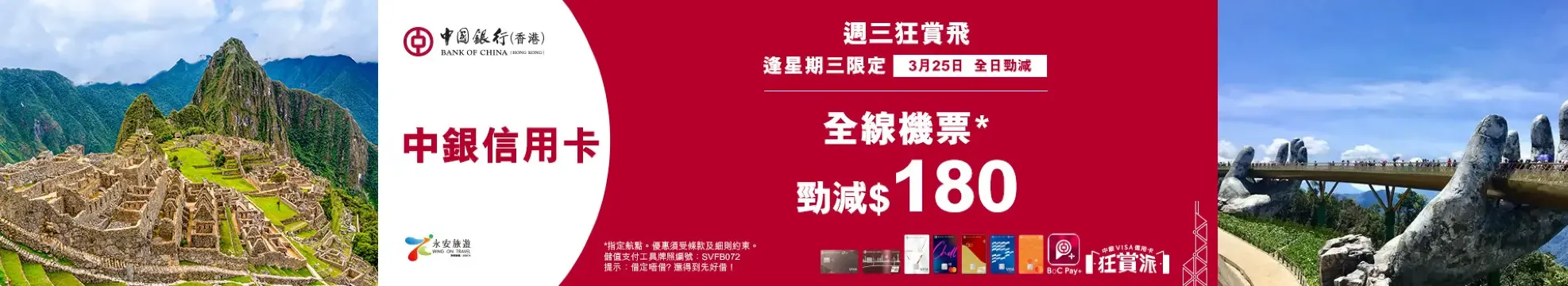 | 機票 | 全線航點* 由香港出發或回程之單程/來回 | 淨機票 13% OFF 最高減$180 | BOCT353 |