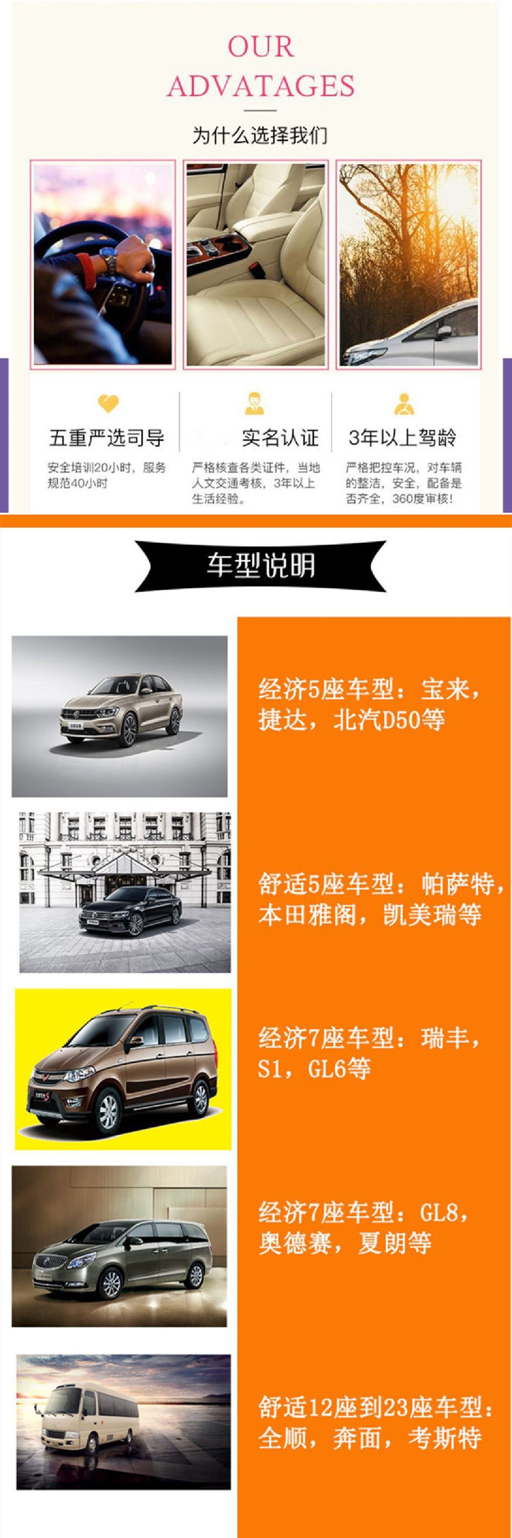 北京五環路內任意一個地點免費上門接送,出發時間自由,可以隨時返程。超範圍或者多地點接送要補費用,請諮詢客戶服務支援。總服務時長10個小時含路程,超時7座(含)以下車型50元/小時,9座(含)以上車型100/小時,超時費請直接支付給司機師傅。 本行程無導遊服務,客人到景區後自行遊玩無工作人員陪同。請注意長者和小孩的人身安全避免發生意外,如果在景區遊玩過程中發生人身傷害或者財產損失責任自負,請知悉。交通