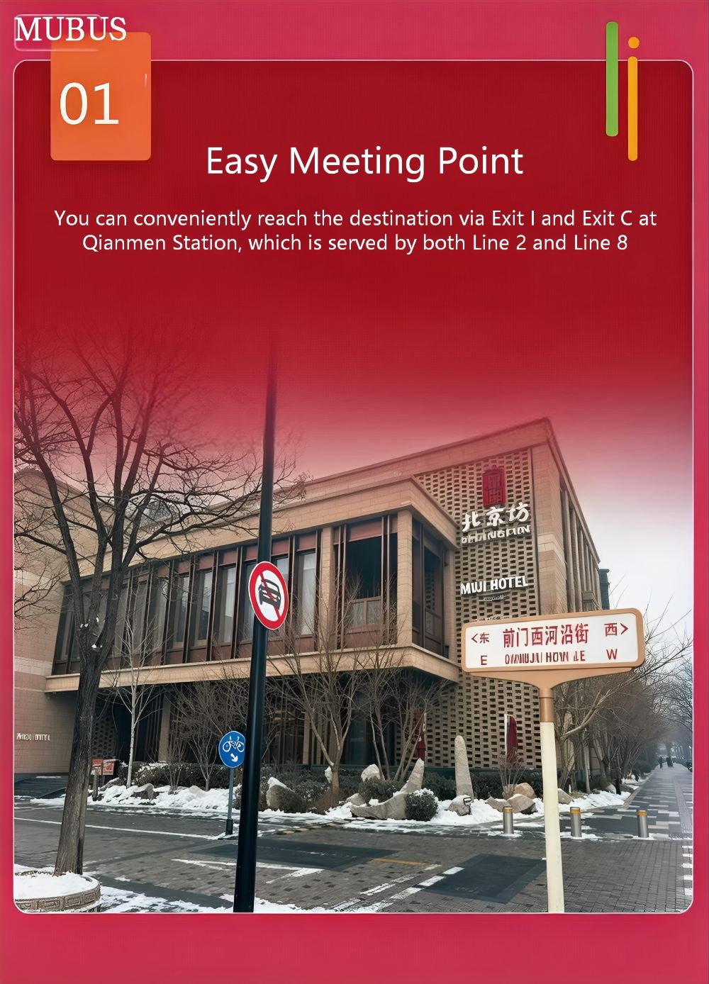 無印良品酒店: 乘搭地鐵2號線或8號線,於「前門站」下車。從i出口出站後向西步行300米即可到達集合地點。 乘搭的士:無印良品酒店北京坊分店。地址:中國北京市西城區大柵欄街道廊房頭條21號院2號樓景點活動