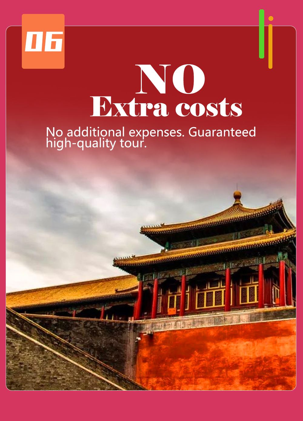 - 天安門廣場、故宮及珍寶館門票全包,無任何隱性費用。