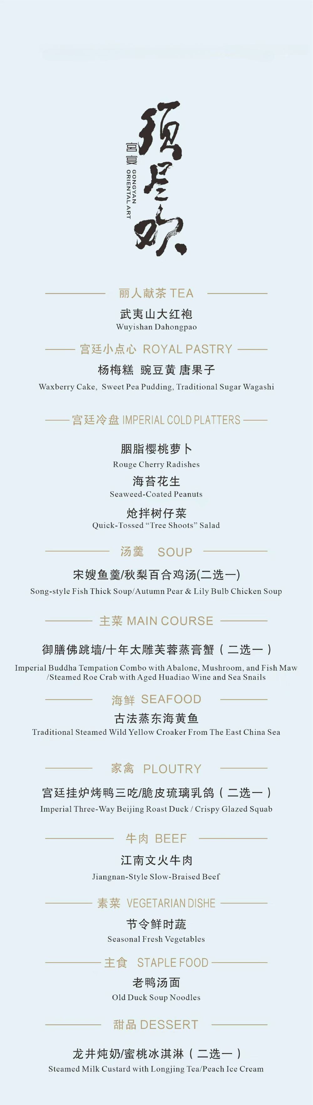 * 北京宮宴集餐飲、教育、學研、文化交流於一體,以周朝飲食禮制中的「燕享食禮」為藍本,深度挖掘宮廷食禮文化,致力將延續數千年的宮廷飲食文化精髓呈現給每位賓客,讓大家沉浸式感受宴、食、禮、樂相融合的藝術雅趣。