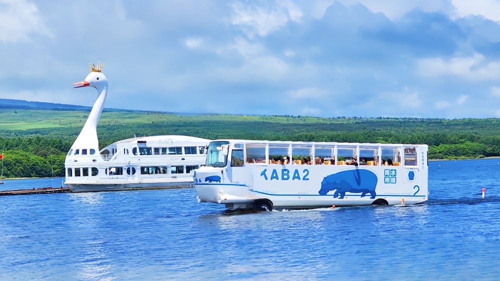 ▲ KABA水陸巴士或山中湖遊覽船“天鵝湖”自由活動, 如果喜歡自由,也可以選擇搭白鳥號遊船, 或在湖邊悠閒拍照喝咖啡,氣氛輕鬆。 可以選擇搭乘KABA水陸兩用巴士—— 它會從公路一路駛進湖中!下水瞬間非常特別。 *不同套餐包含項目不同,如因景點問題遇遊船無法乘坐會退還船票錢,其它費用概不退還。