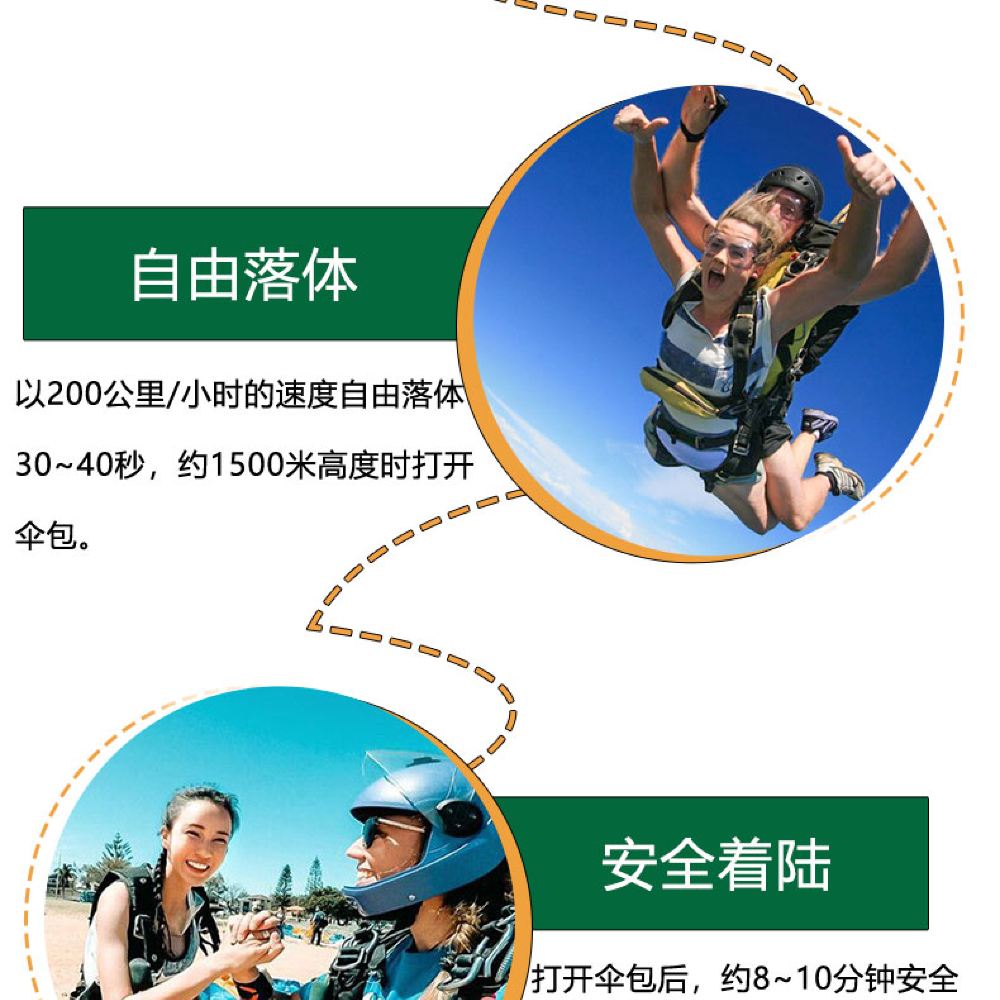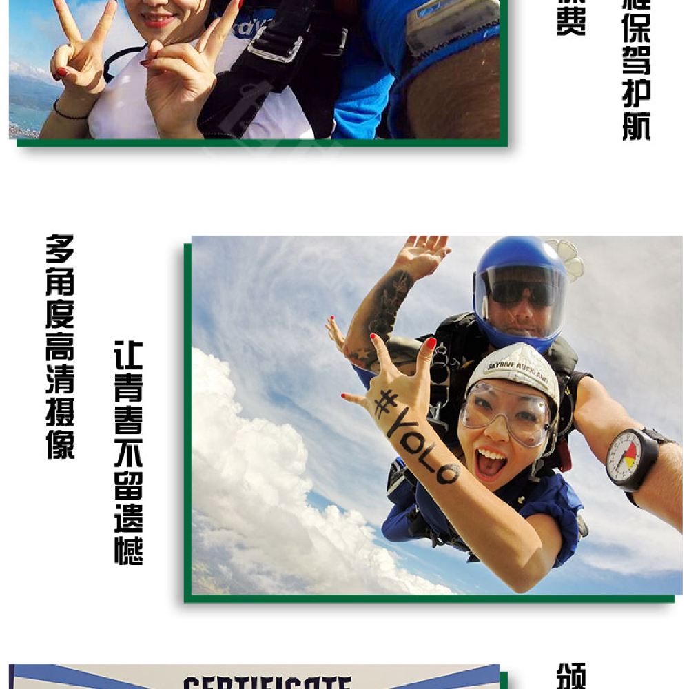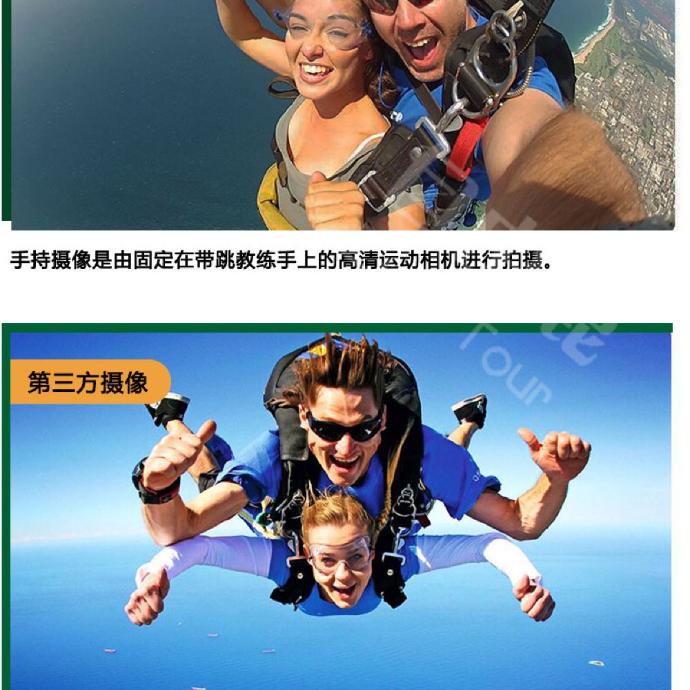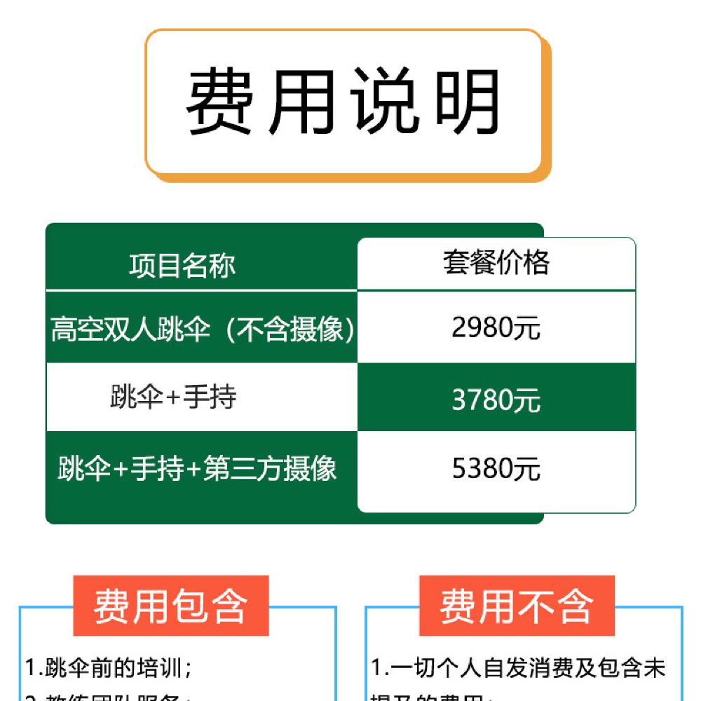 2. 整個跳傘活動,包括從當地酒店來回往返跳傘基地的乘車時間,包括空管和天氣等不可抗力因素建議預留1~2天時間體驗;