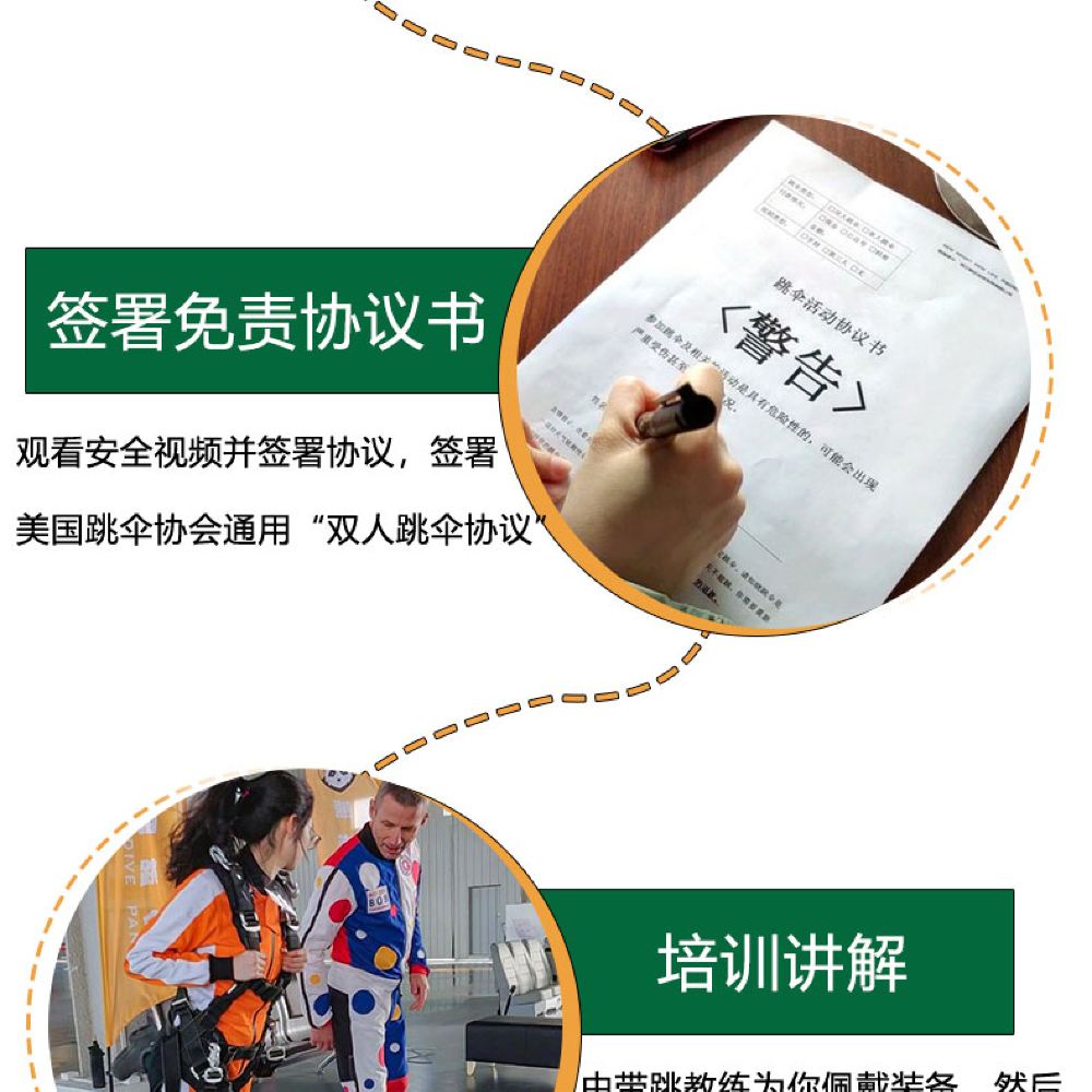 6. 建議跳傘前一晚不要大量飲酒,跳傘前不要吃太飽,潛水後24小時以內不允許跳傘。孕婦、有心腦病史、嚴重高血壓患者及其他特殊旅客不能參加跳傘活動,過程中如有身體不適需及時向教練反應;