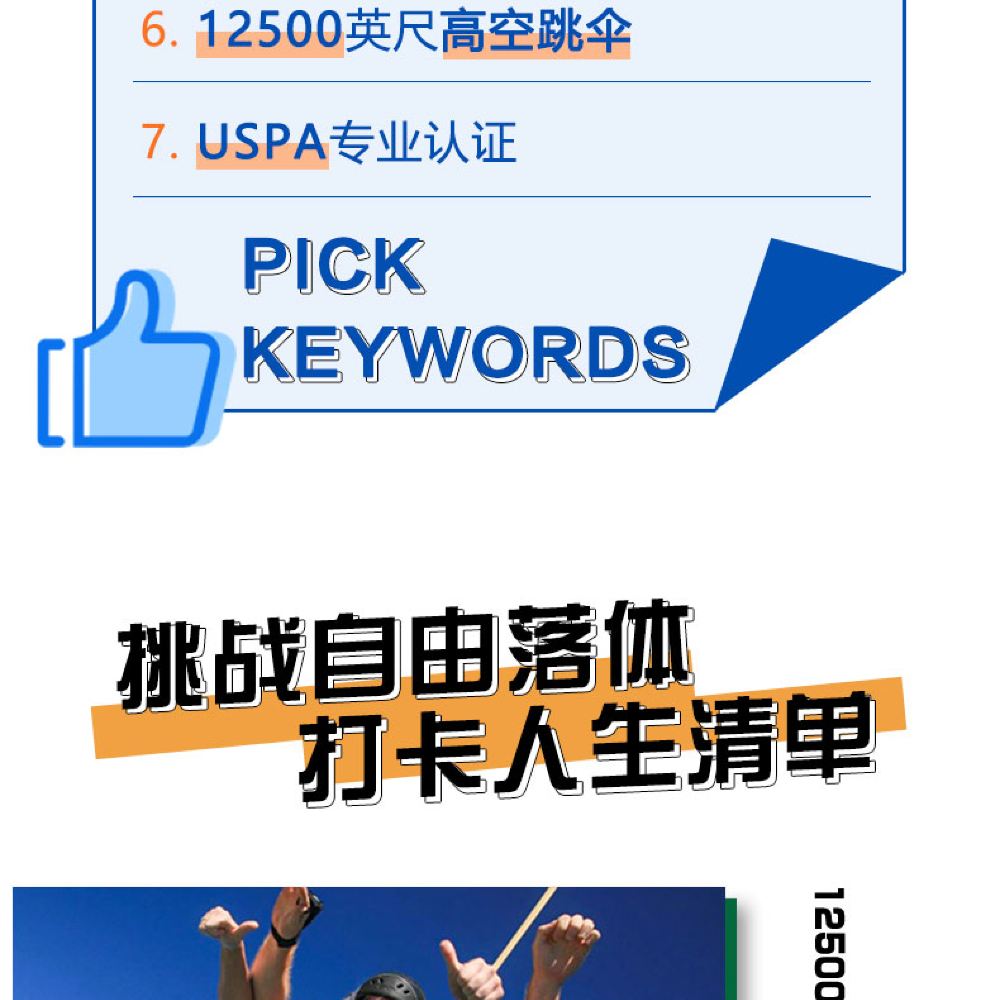 8. 考慮到安全因素,USPA不允許任何200跳以下的個人在跳傘活動中使用照相或攝像設備。但是您可以在地面進行準備登機前的拍照,如果您希望拍攝跳傘時的畫面,我們提供專業的攝影師可以和您一同跳傘,幫您記錄下難忘瞬間;