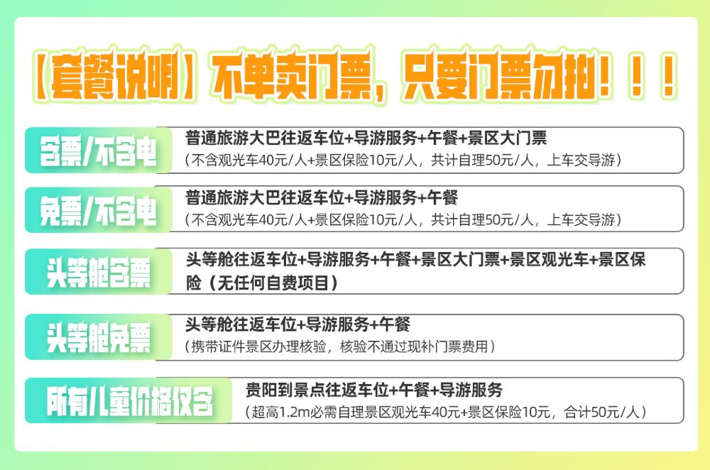 ▲ 本產品已按旅行社折扣價提供綜合優惠,如有免票證件,請選擇優待人群或免票套餐下單,如拍成人全票套餐,只能按50元/人退門票優惠。 所有優惠證件需通過景區現場核驗,以景區核驗結果為準,請攜帶好相關證件正本或電子證件出行。 現時貴州景區實行網上提前預約門票,如有特殊優惠證件的,請直接下單優待人群並告知客戶服務支援免票證件類別,如團上臨時告知,因門票已經提前預約無法取消,則無費用退還。 如需在花果園上車,請提前諮詢客戶服務支援哦~