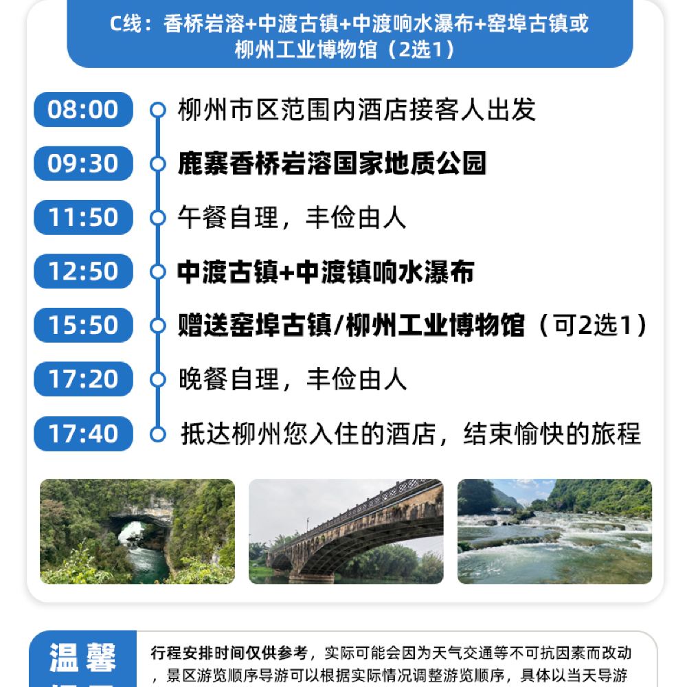 於指定地點接載08:00 柳州 於指定地點接載 柳州市區指定範圍內上門接送 【溫馨提示】: 1、接站時間會根據當日遊客所住酒店位置而調整,具體接站時間請以司導在出遊前1天晚上實際通知為準。 2、暑期及節假日期間因遊客多排隊、堵車等因素,出發時間會比平日提早,具體時間以司導實際通知為準。