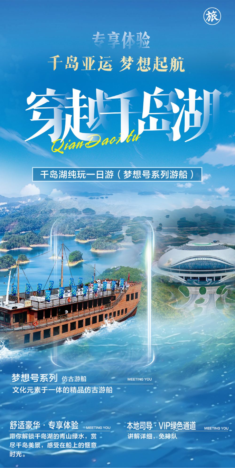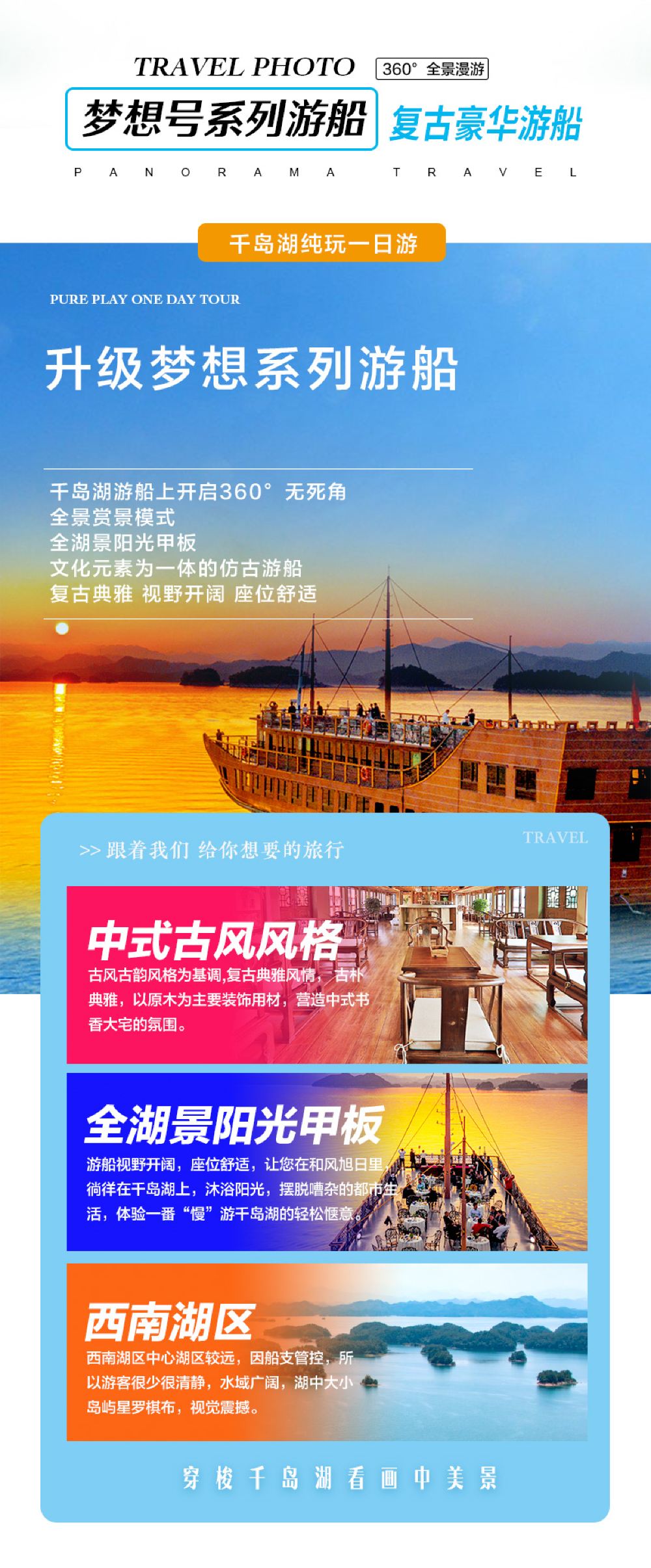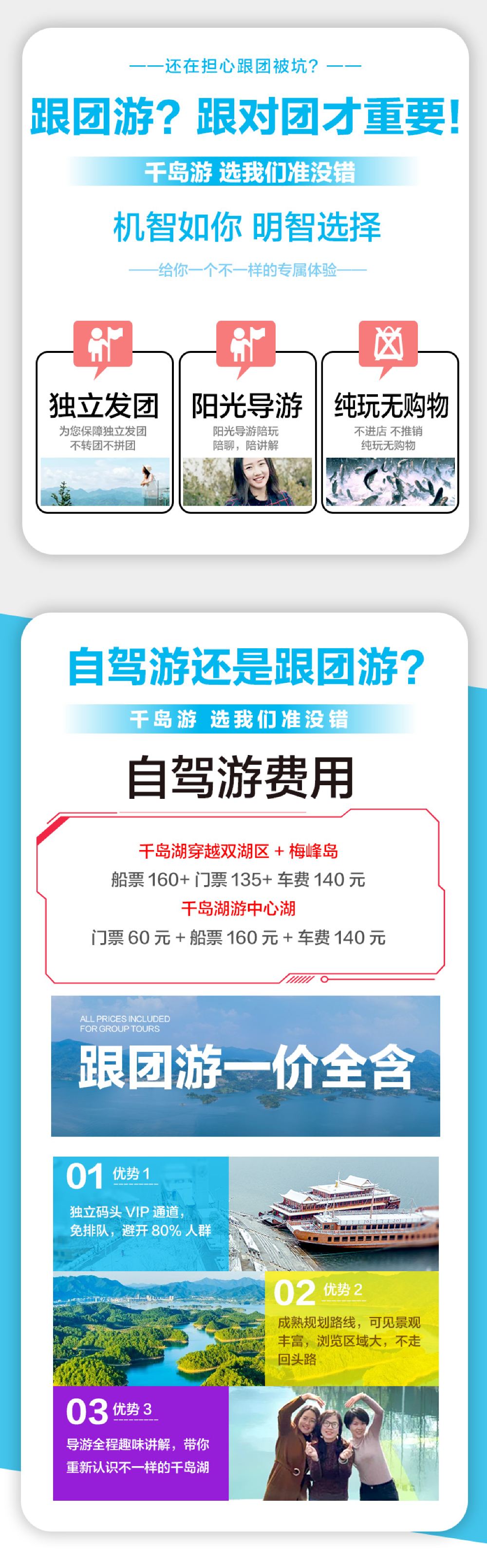遊船升級:我們家的全景千島湖,採用夢想系列遊船-夢想5號/3號營運航線,造價千萬以上,配備專屬碼頭,只有船等人,不在常規碼頭人擠人,還可以在船上享用中餐,邊賞景邊用餐,尊享品質。