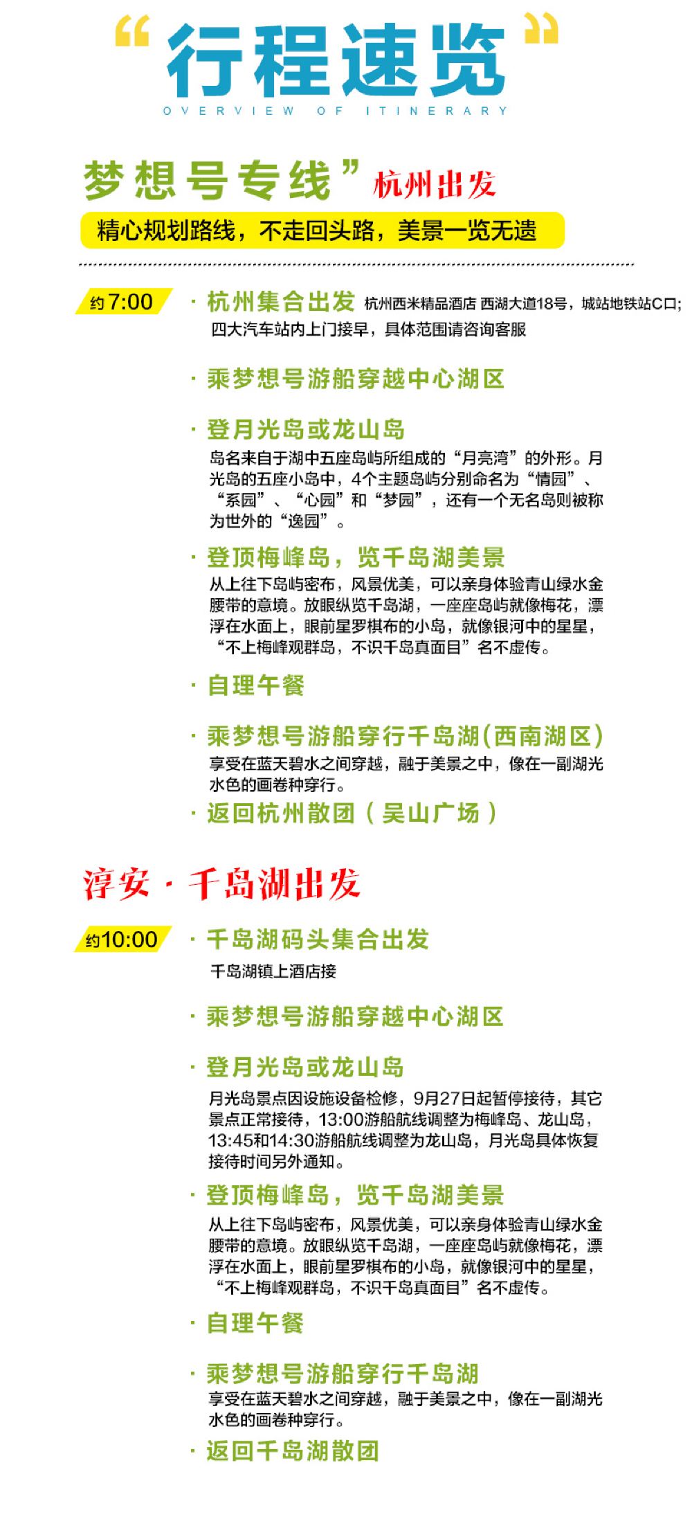 18:30 杭州 吳山廣場 解散 抵達杭州後,前往吳山廣場附近散團。18.00-18:30左右抵達杭州吳山廣場附近自行散團,結束愉快的千島湖之旅。 【特別說明】以上時間僅供參考,受當天船務、路況、客流量等影響,遊覽時間以當天導遊安排為準,到達杭州的散團時間以當天實際抵達時間為準。節假日期間返程時間會有延遲,請知曉。 【溫馨提示】本公司用車為正規營運的旅遊車,非客運站班車,不能隨意拉客,不返程遊客的座位無法轉售,因此無法退還單程車費。