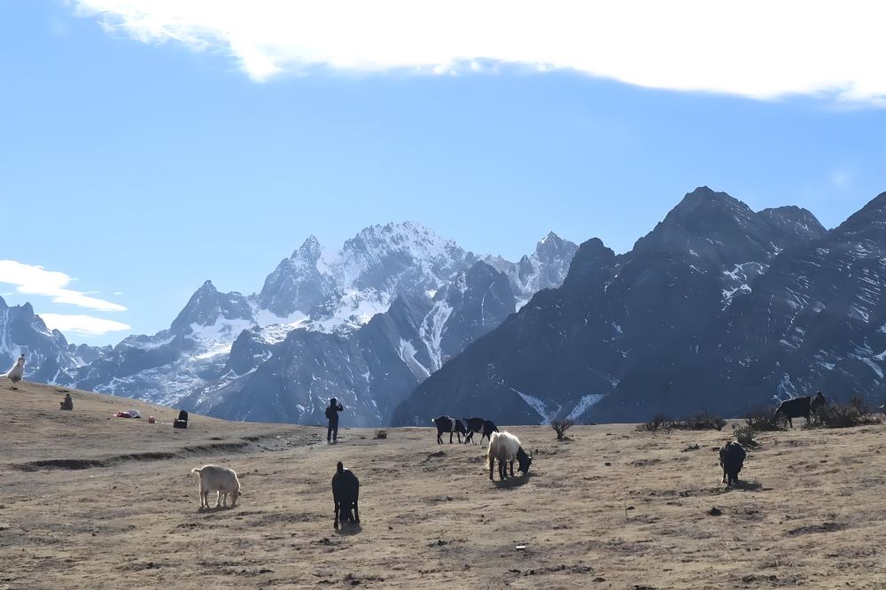 - 乘搭纜車前往山腰的犛牛坪,那裡有犛牛在玉龍雪山的皚皚雪峰背景下吃草。