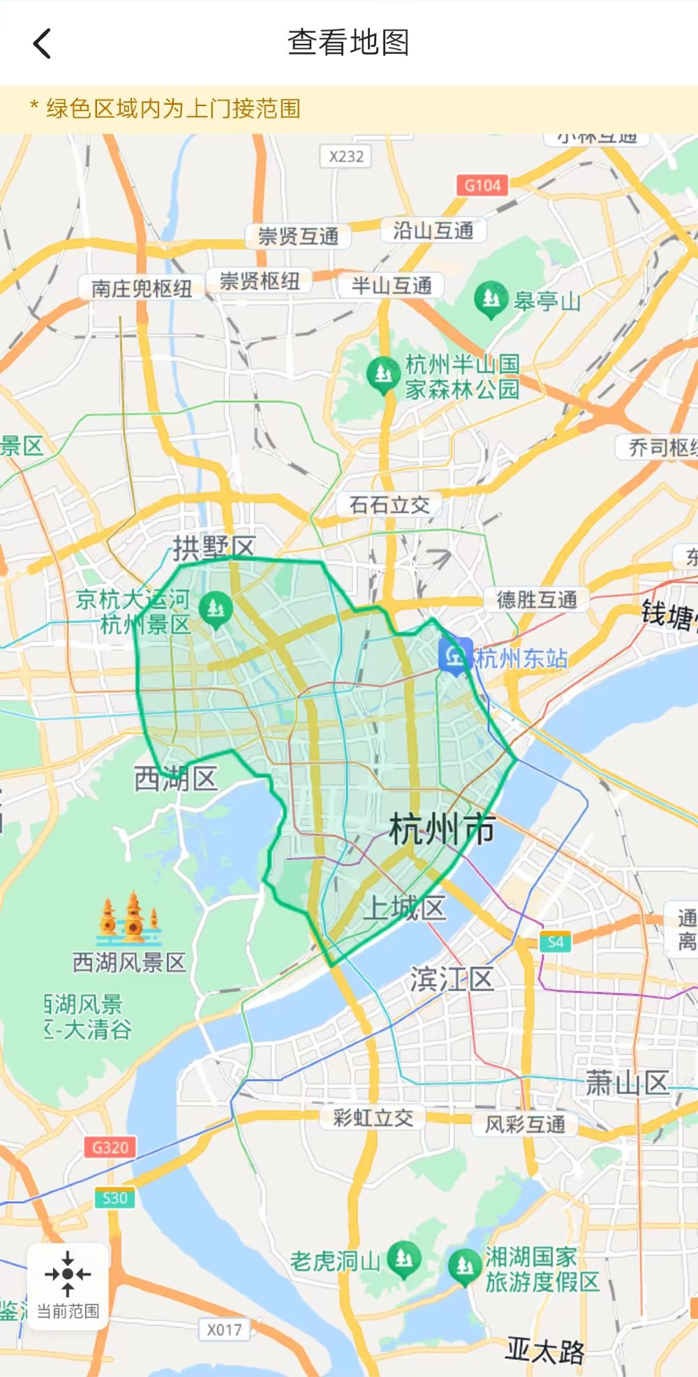 東至杭州火車東站;南至復興路與紫花路交叉口;西至古蕩公交站;北至登雲路。不含下沙蕭山餘杭濱江富陽等交通