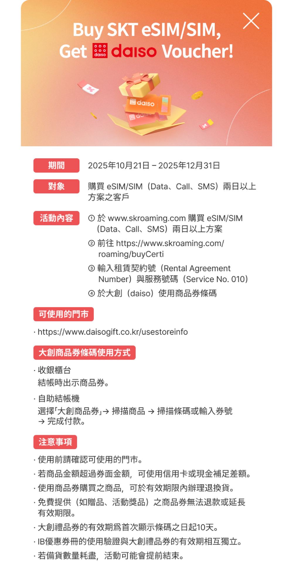 - 活動期間凡購買本商品2天卡以上(包括2天卡),即可線上免費兌換韓國大創(Daiso)1,000韓幣優惠券1張