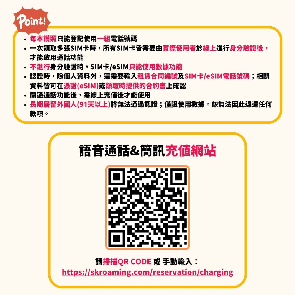 - 語音通話&簡訊儲值網站 : https://skroaming.com/reservation/charging
