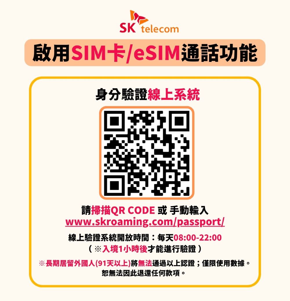 - 抵達韓國及開通SIM卡後,通過線上驗證(網站請按此)後可以啟用語音通話及簡訊功能(1本護照只限1張)