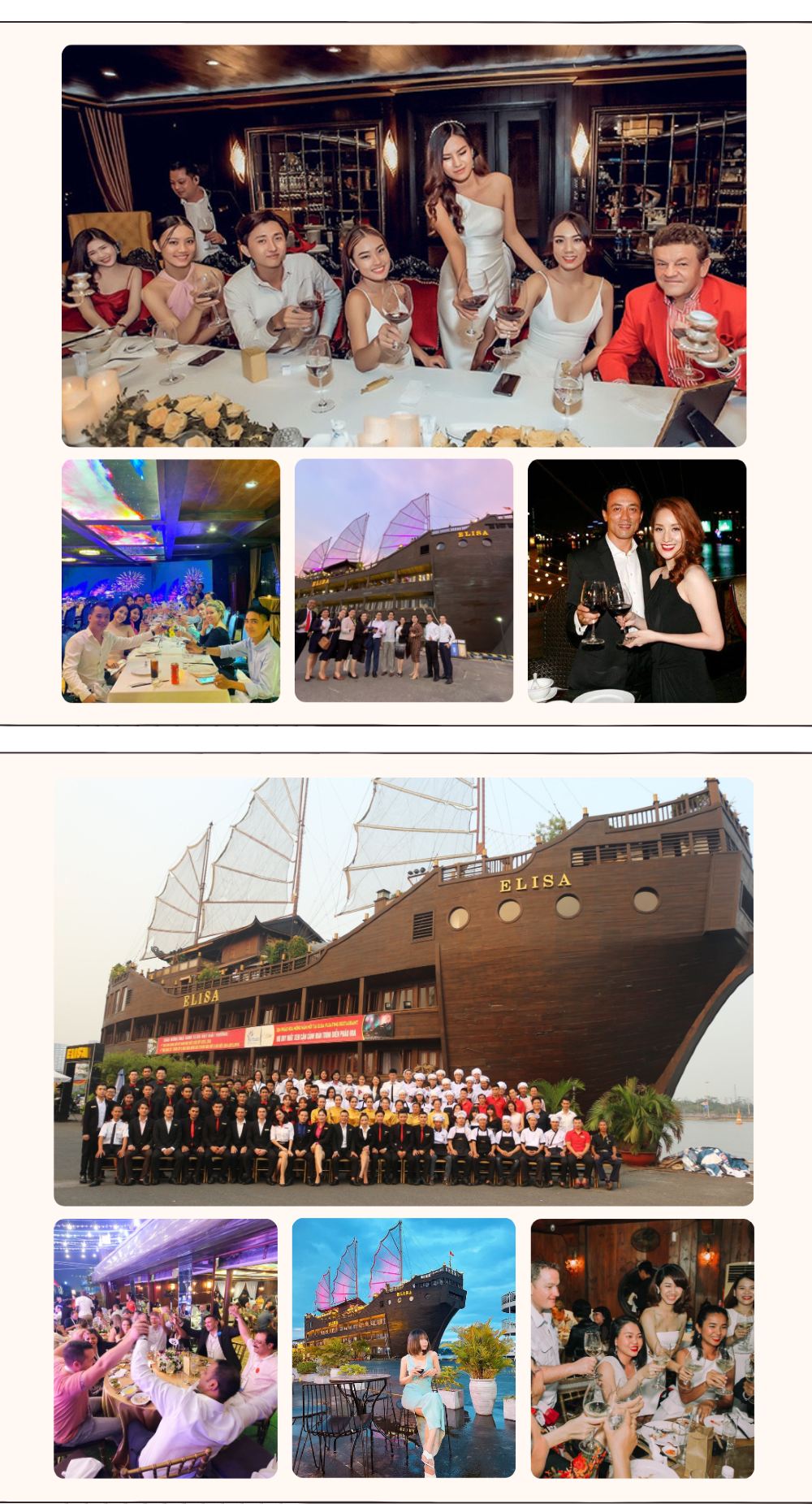 船上供應豐富的越南菜、中餐、海鮮和西式料理,無論是家庭聚餐、情侶約會或商務接待,Elisa 都能提供合適的座位安排和用餐氛圍。
