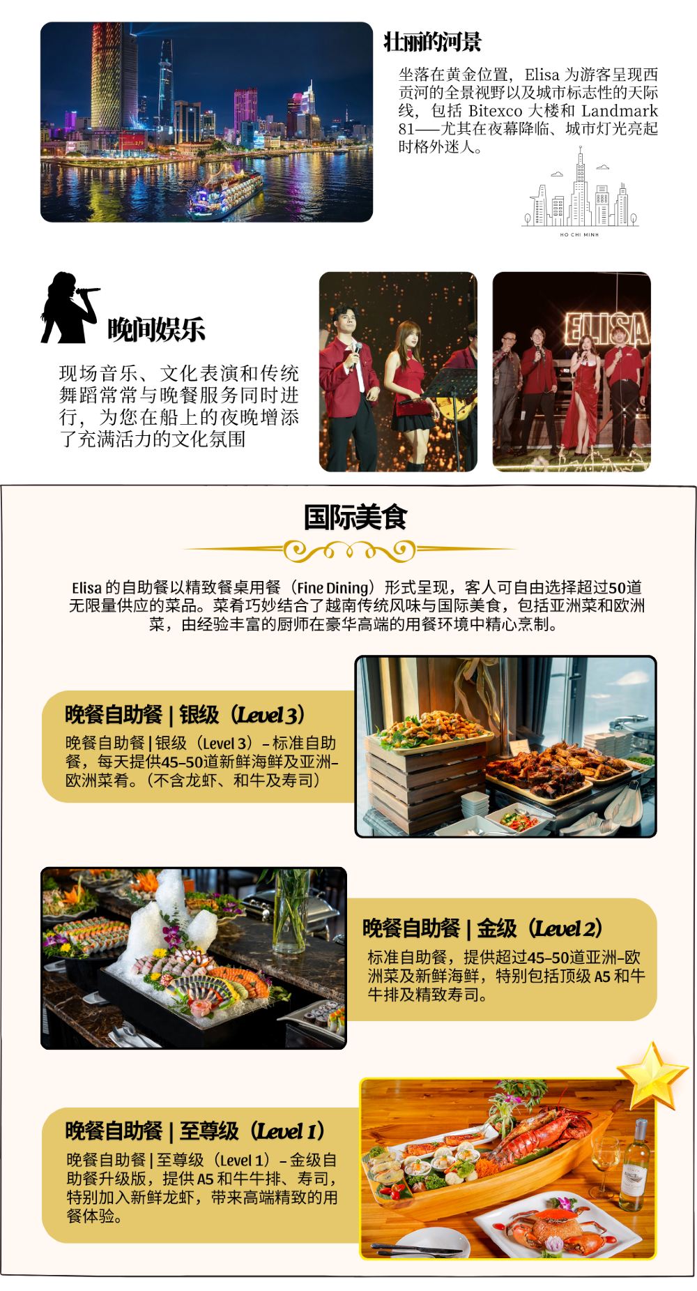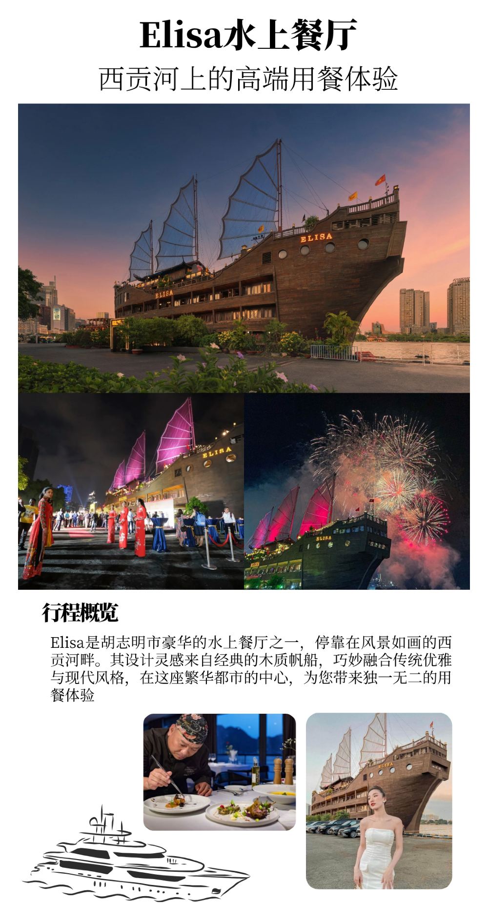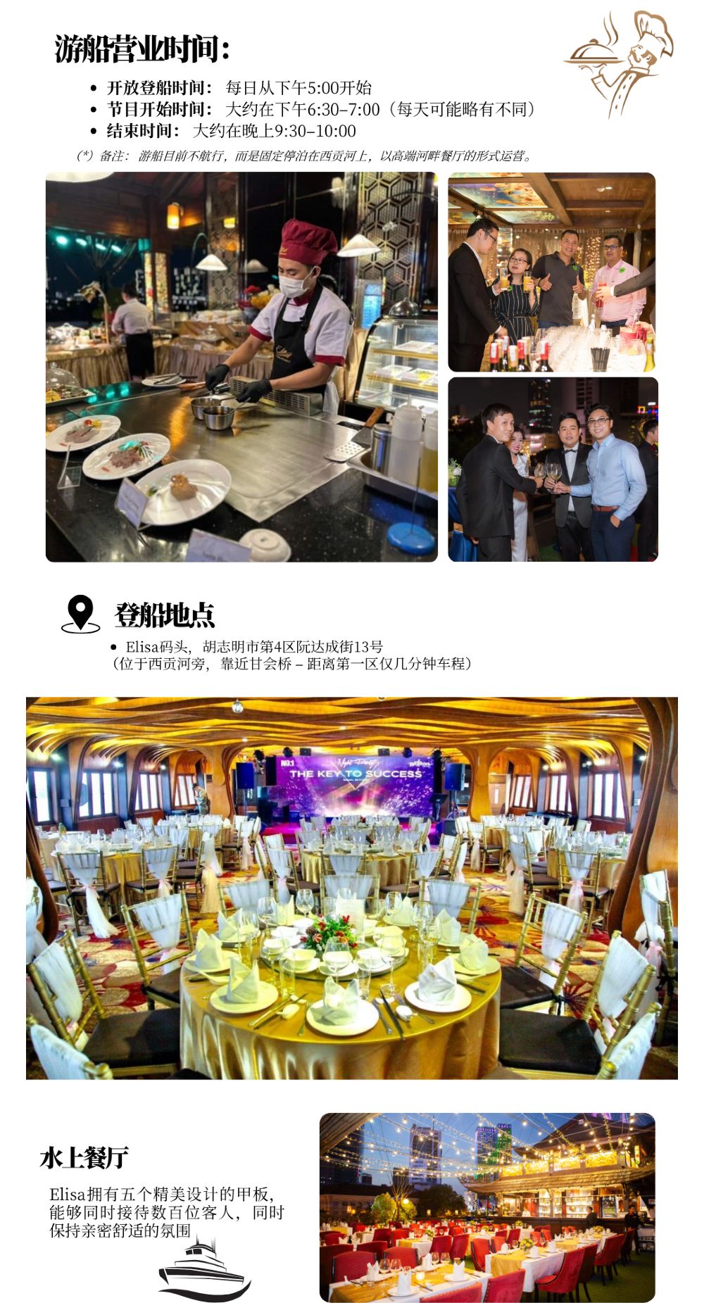 - ELISA餐廳是一家固定在西貢河上的水上餐廳,並不是遊船晚餐。餐廳不會在河上行駛,也沒有出發或航行的行程安排,請知悉。