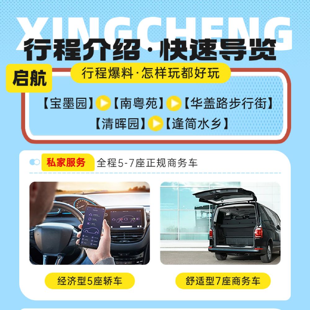 - 精華旅程:全程精選具代表性、人氣高的精華景點,一天遊番禺寶墨園+南粵苑+順德清暉園博物館+逢簡水鄉+華蓋路