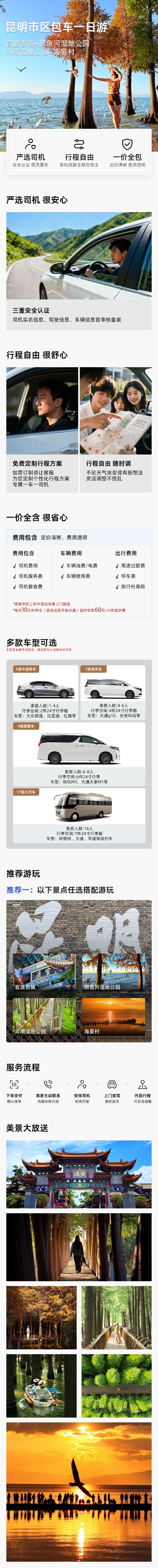 於指定地點接載09:00 昆明 於指定地點接載 1、昆明市區三環內免費上門接送,超出範圍收費詳詢客戶服務支援! 2、全程安排一輛車為您們服務,不拼任何陌生人,接到您們之後才開始計時,總共有10小時的包車時間,油費、過路費、停車費、旅行社保險全部都包含在裡面了,司機的午餐司機自己解決! 3、我們的包車服務時長為10小時,從接到您開始計時,若行程稍有延遲,超出時間不多的話,不會額外收費,若超時較長按60元/小時收費。