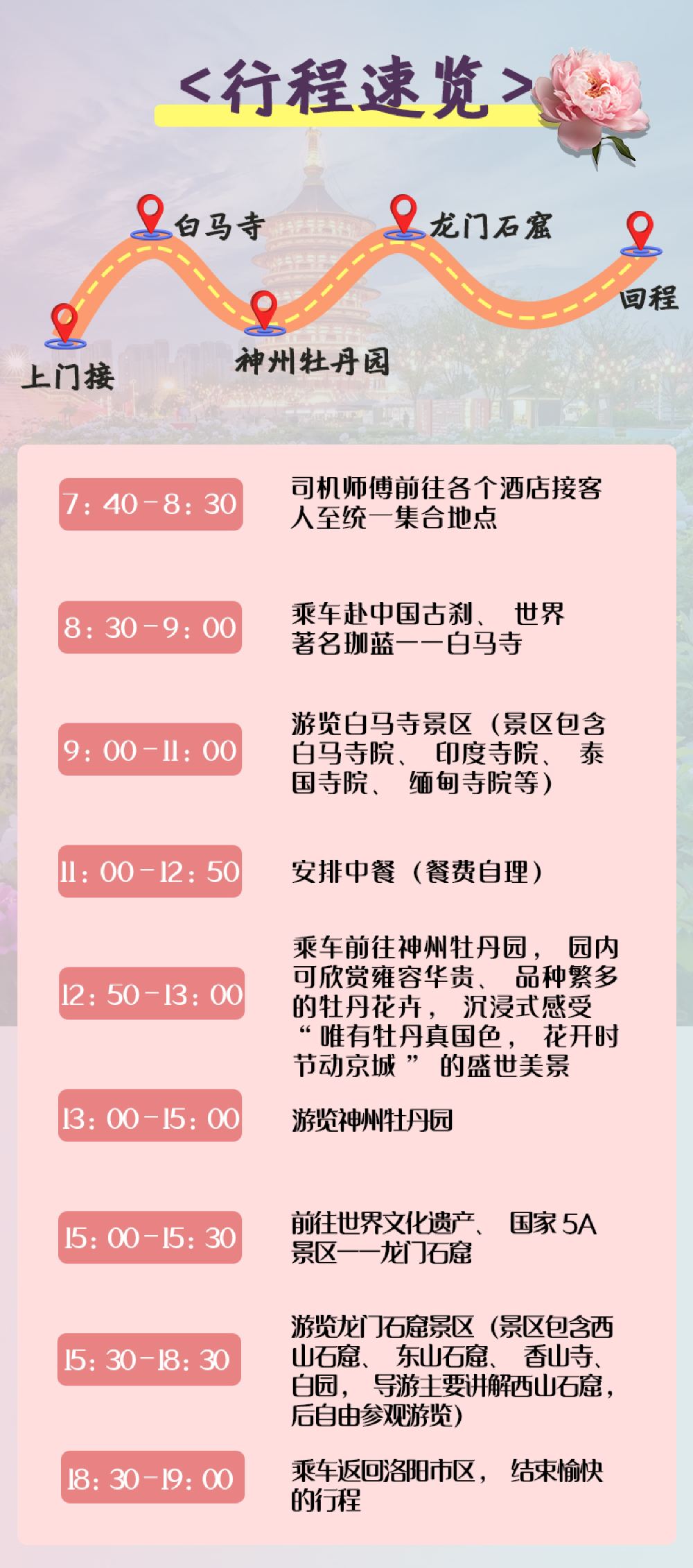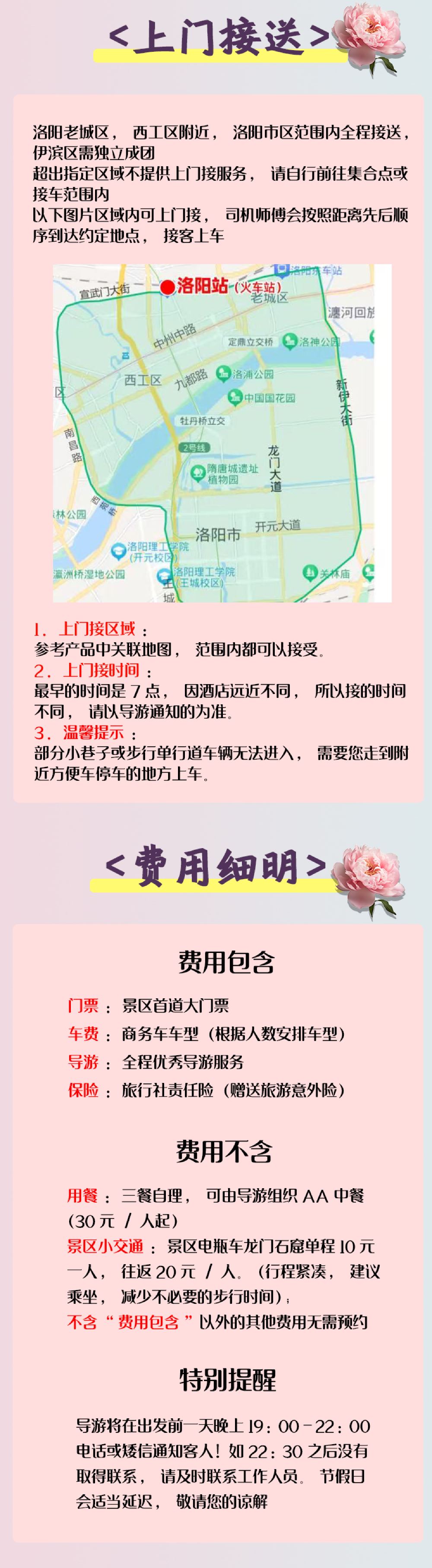 18:00 於洛陽下車 指定區域以外不提供接送服務 不含演出套餐的遊客行程結束後專車送回酒店或洛陽市區任意位置,行程當天可免費送高鐵站/火車站。