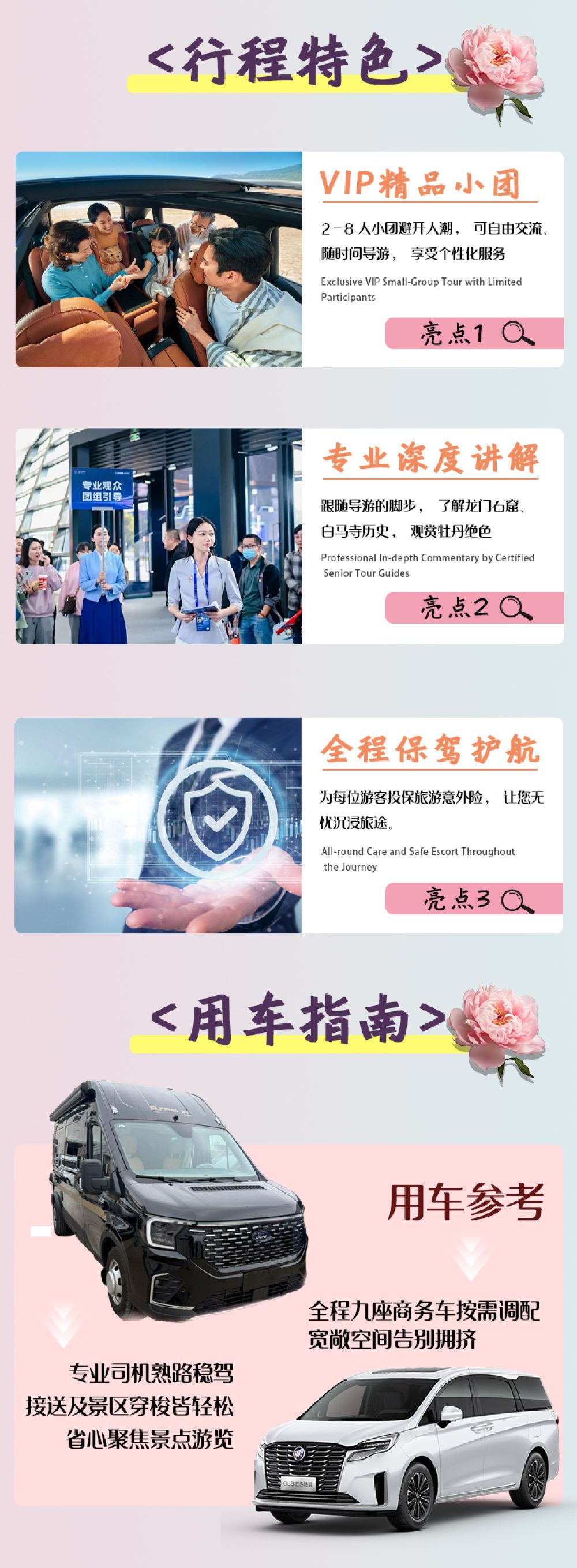 1.洛陽酒店均可提供上門接送服務,出行當天高鐵站/火車站均可免費接站。之後前往第一個景區。